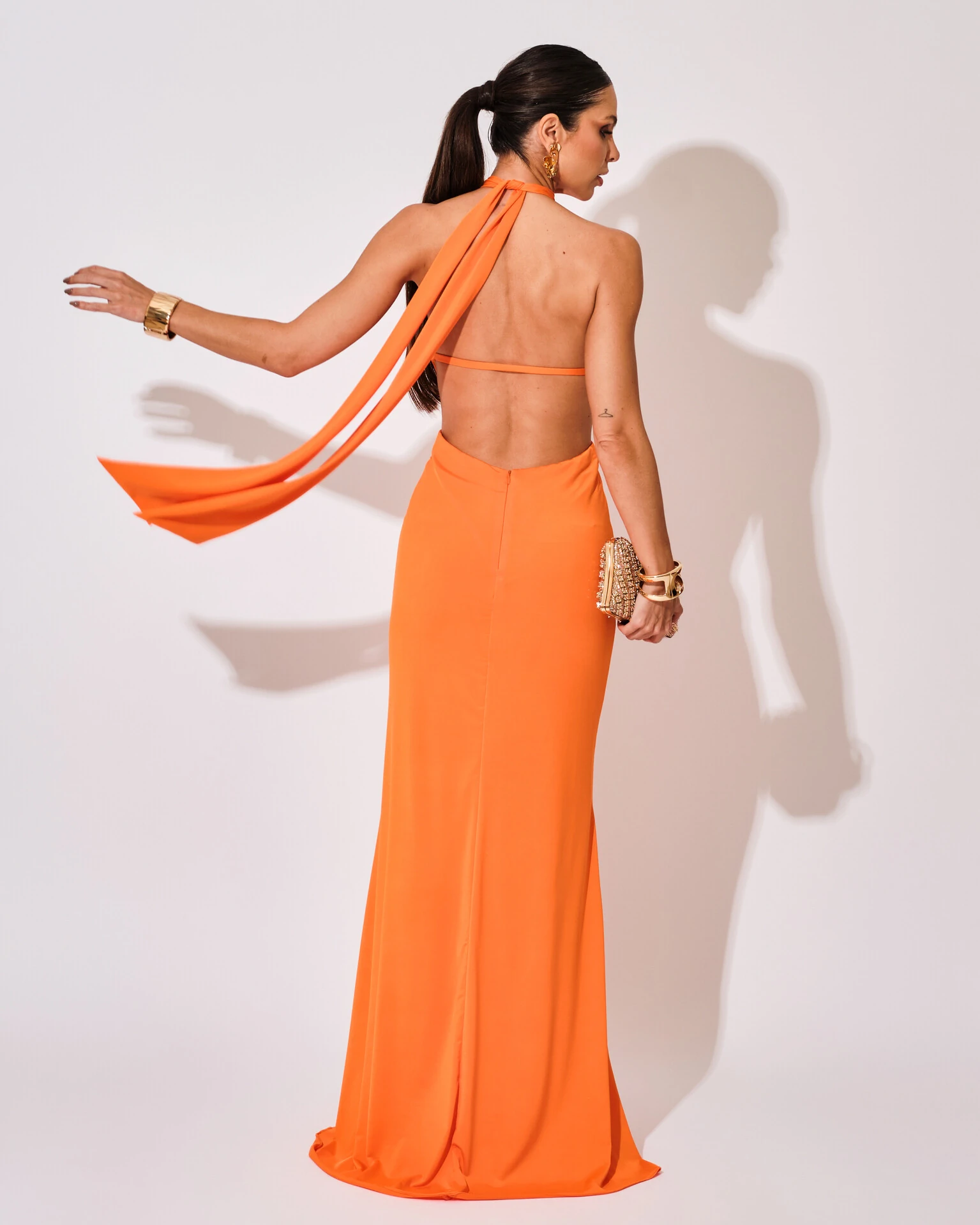 Vestido de Festa Longo Malha Jersey Gola Alta Saia Sereia Laranja