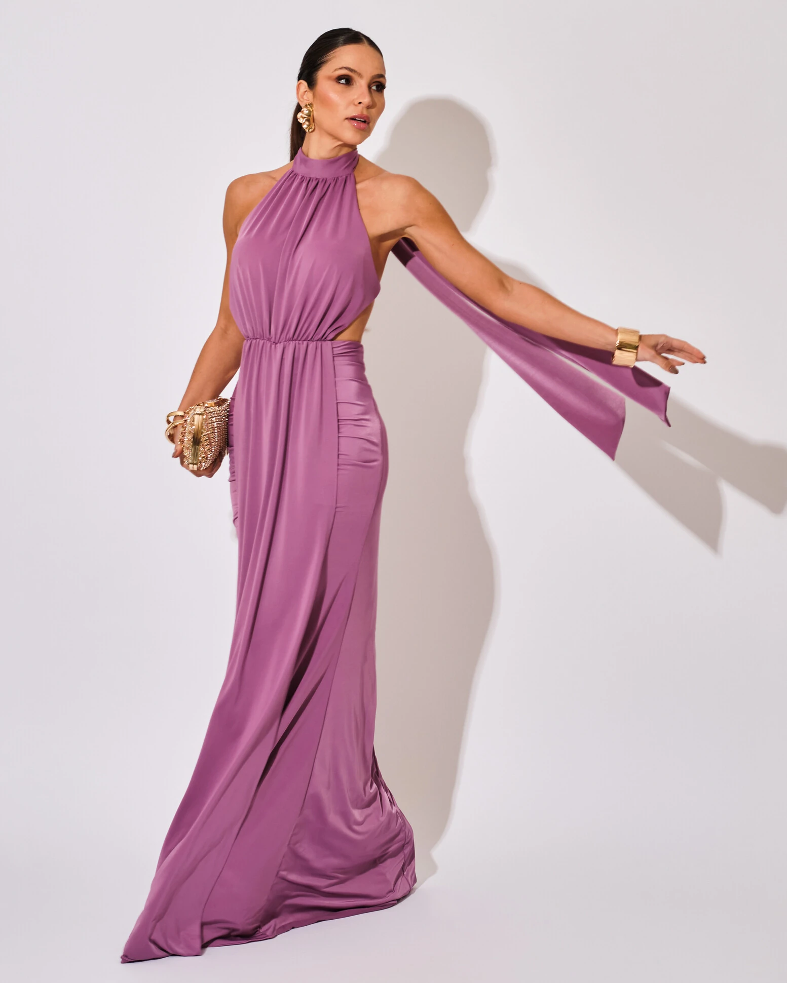 O vestido é confeccionado em malha jersey, um tecido de caimento leve e fluido que se ajusta suavemente ao corpo, proporcionando conforto e elegância. Possui modelagem longa com decote halter e gola alta, destacando os ombros e o pescoço de forma sofisticada. As laterais abertas adicionam um toque sensual e moderno, enquanto o drapeado sutil na região da cintura cria um efeito alongado e valorizador da silhueta. O caimento do tecido confere movimento e brilho discreto, ideal para ocasiões especiais.