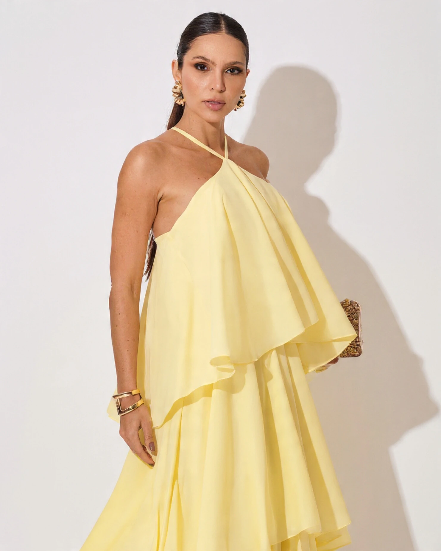 Frente única , enquanto a cintura levemente marcada proporciona um caimento perfeito. As camadas de babados adicionam um toque romântico, tornando este vestido ideal para um visual sofisticado.