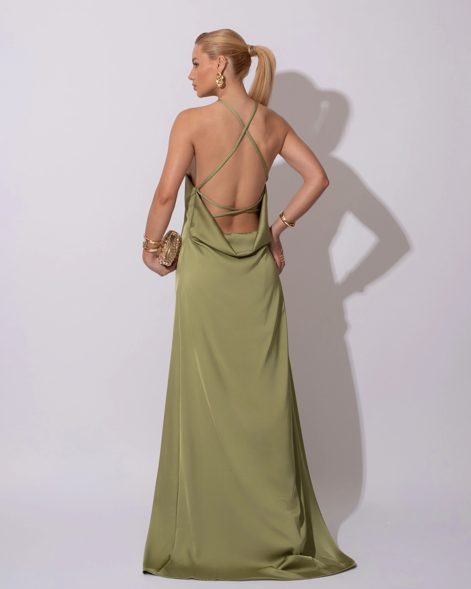 Vestido Longo de Cetim com Decote Triangular e Amarração nas Costas Degagê Verde Pistache