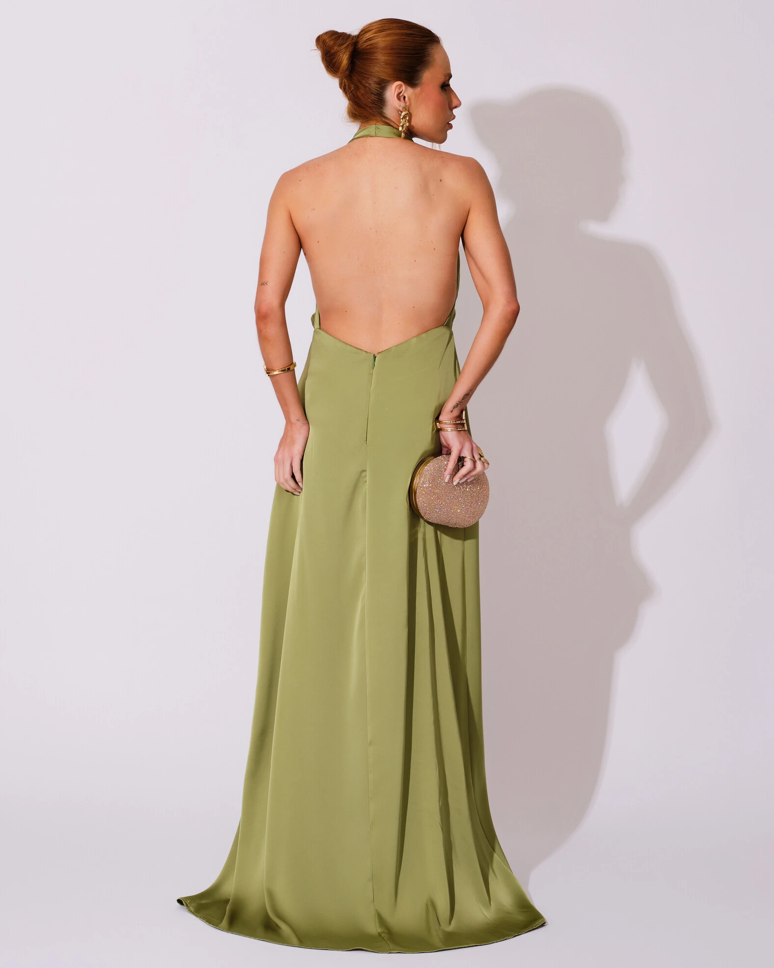 VESTIDO DE FESTA LONGO FRENTE ÚNICA DEGAGÊ CETIM FLUIDO - O vestido é a escolha perfeita para quem busca sofisticação com um toque de sensualidade sutil. Com seu caimento fluido e elegante, valoriza a silhueta de forma delicada, sendo ideal para casamentos, formaturas, jantares de gala ou eventos noturnos em ambientes refinados, como salões ou espaços ao ar livre bem decorados. Para complementar o look, aposte em acessórios dourados ou prateados, dependendo da cor do vestido, além de uma clutch sofisticada e sandálias de salto fino. Um coque baixo ou ondas soltas no cabelo realçam ainda mais a feminilidade do visual.