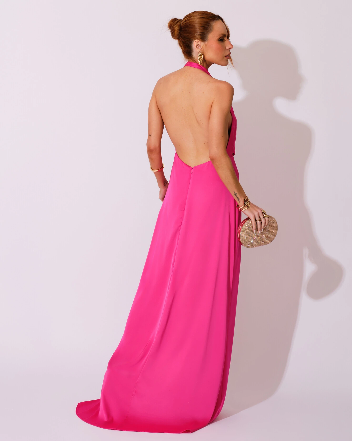 VESTIDO DE FESTA LONGO FRENTE ÚNICA DEGAGÊ CETIM FLUIDO - O vestido é a escolha perfeita para quem busca sofisticação com um toque de sensualidade sutil. Com seu caimento fluido e elegante, valoriza a silhueta de forma delicada, sendo ideal para casamentos, formaturas, jantares de gala ou eventos noturnos em ambientes refinados, como salões ou espaços ao ar livre bem decorados. Para complementar o look, aposte em acessórios dourados ou prateados, dependendo da cor do vestido, além de uma clutch sofisticada e sandálias de salto fino. Um coque baixo ou ondas soltas no cabelo realçam ainda mais a feminilidade do visual.