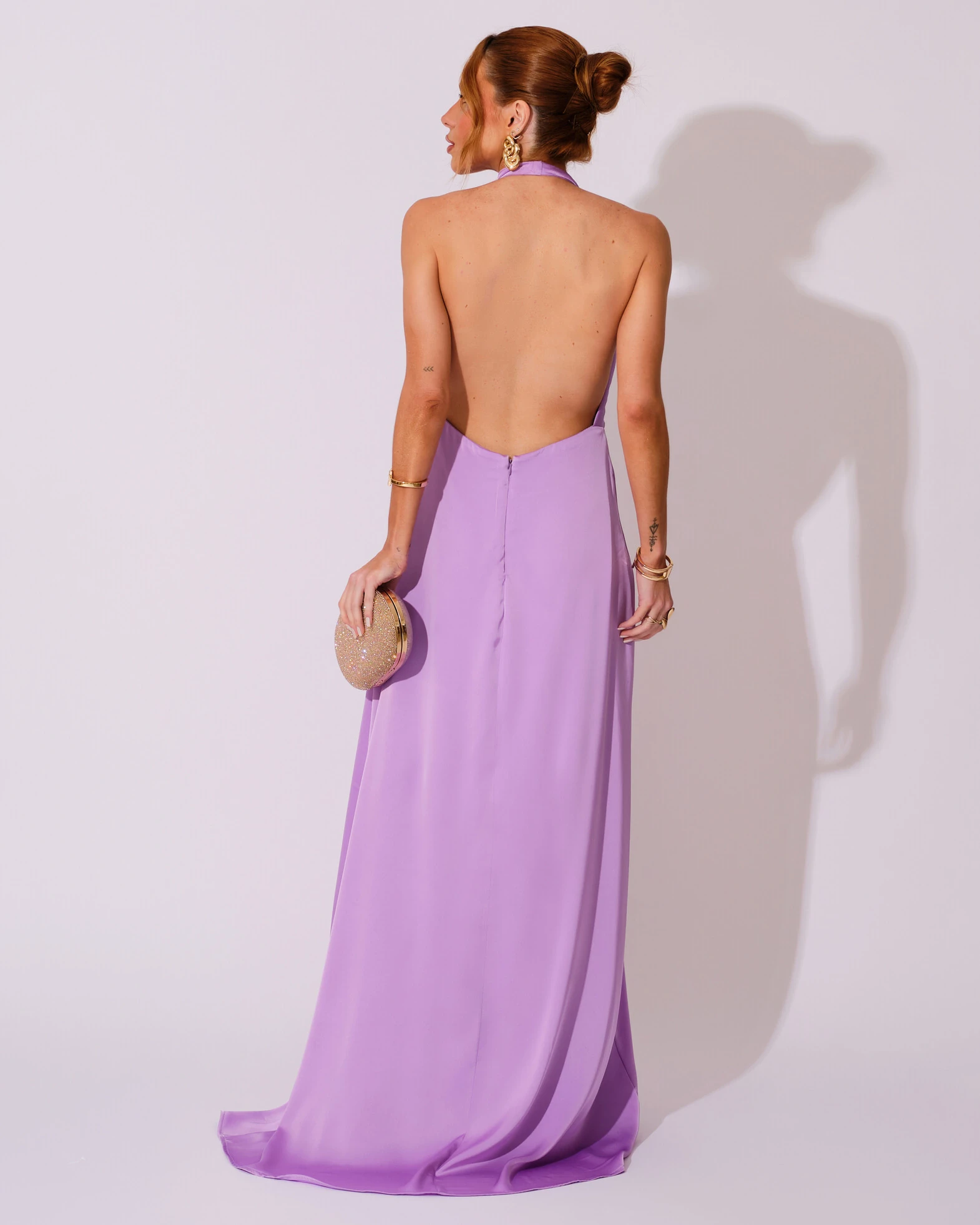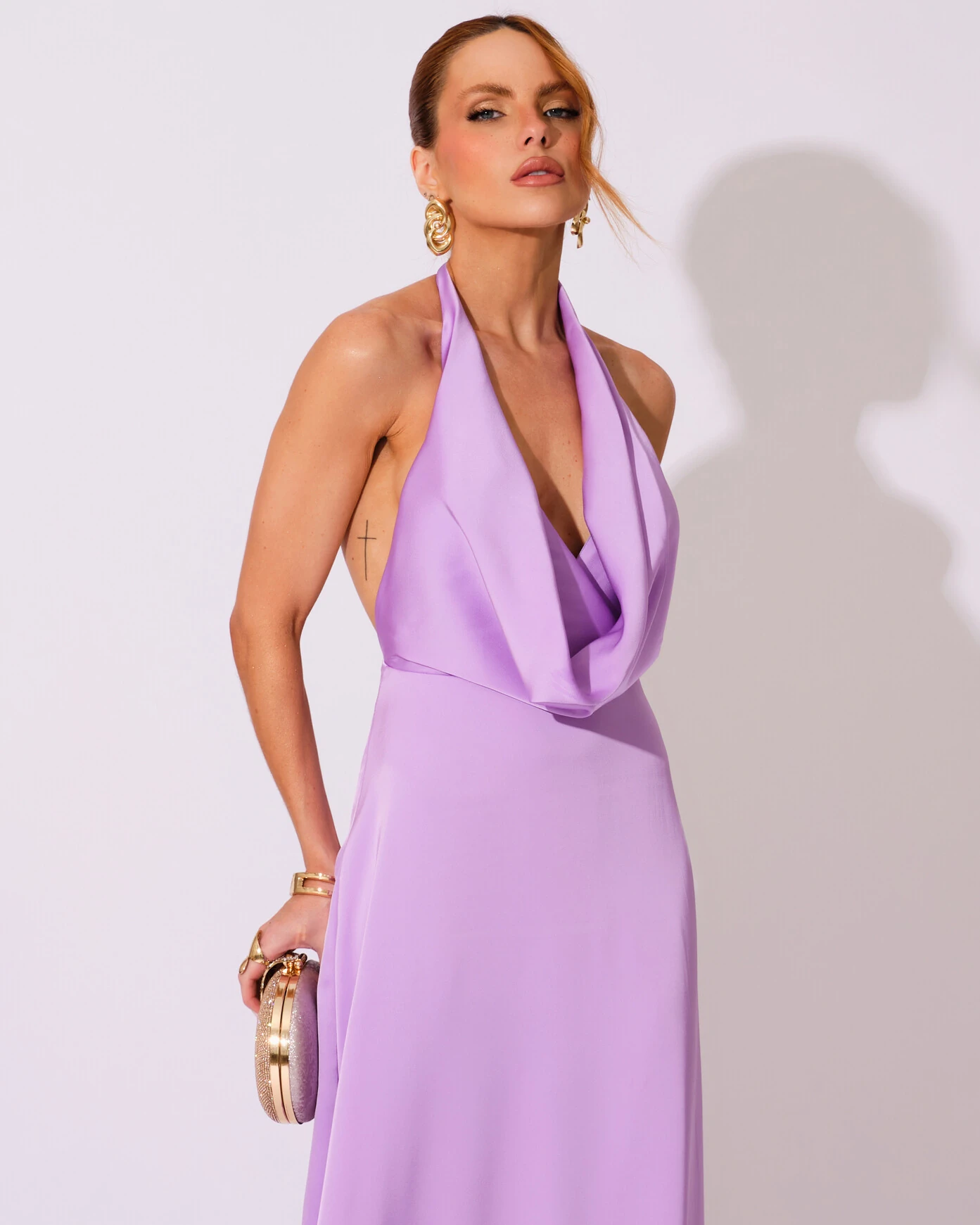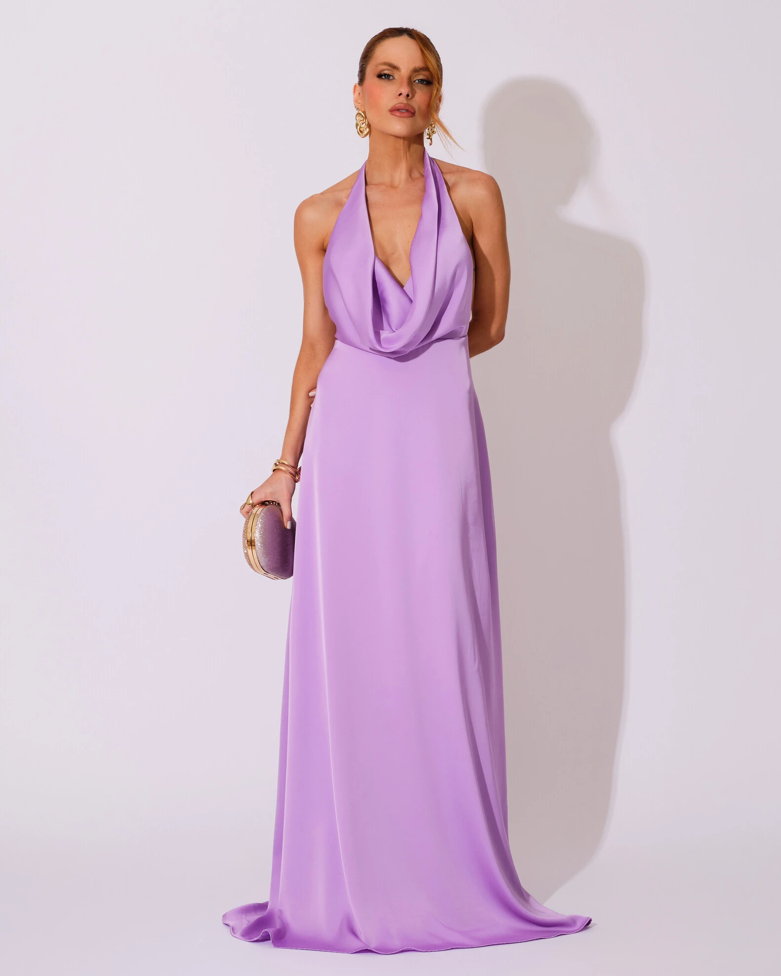Vestido de Festa Longo Frente Única Degagê Cetim Fluido Lilás