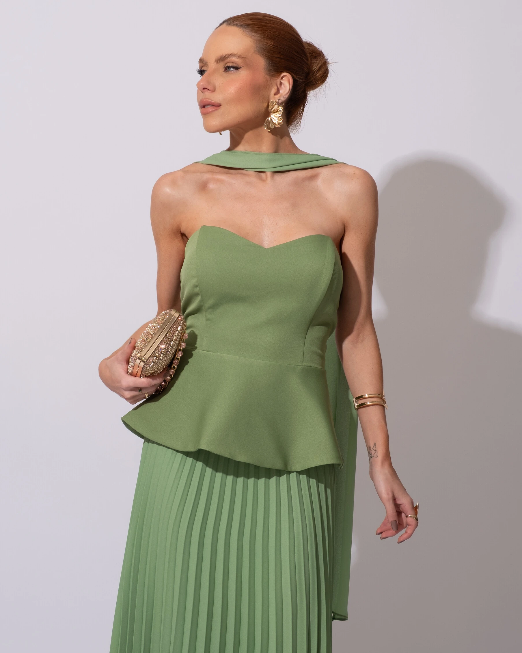 Vestido de Festa Longo Alfaiataria Tomara que Caia Saia Plissada e Lenço Verde Matcha