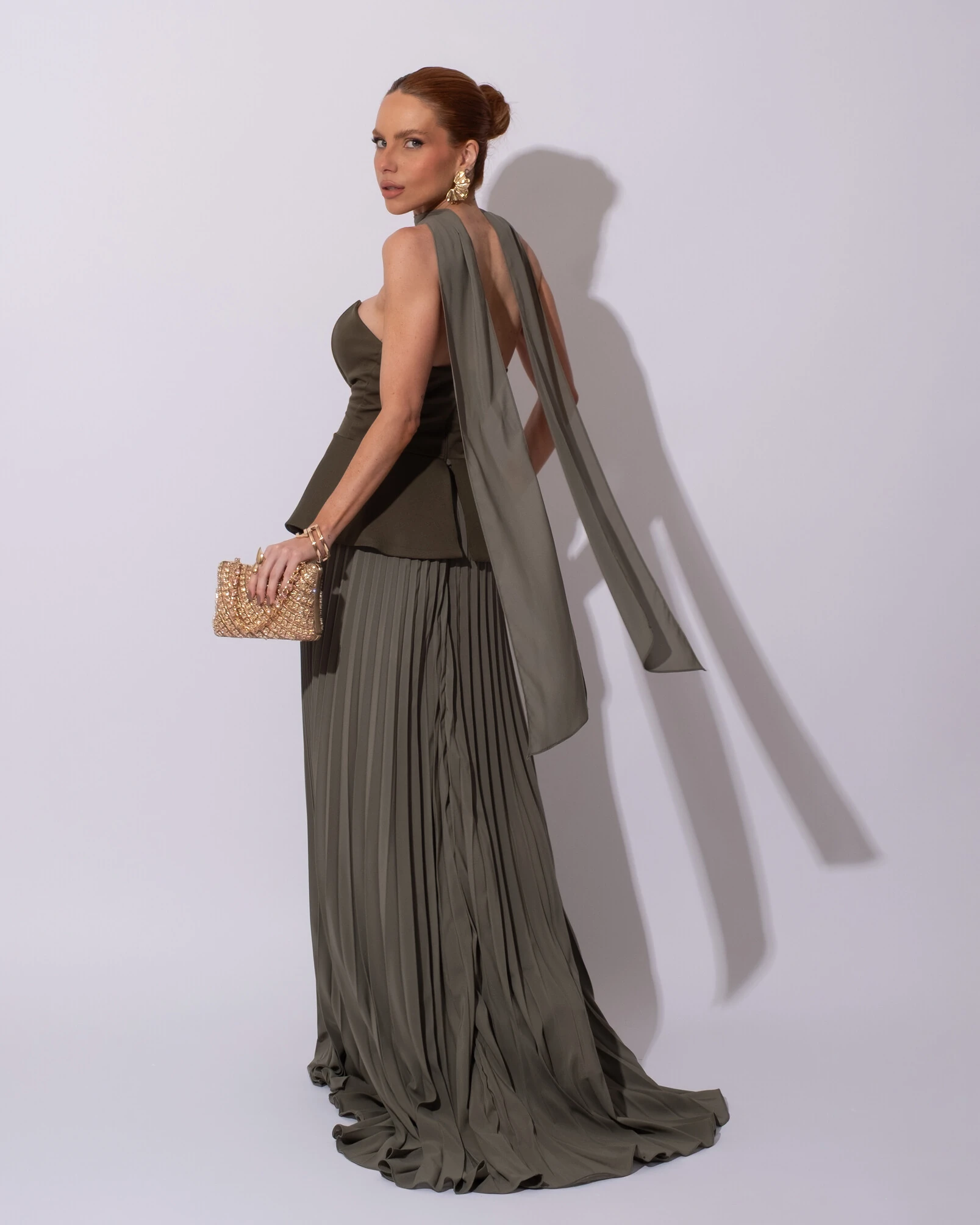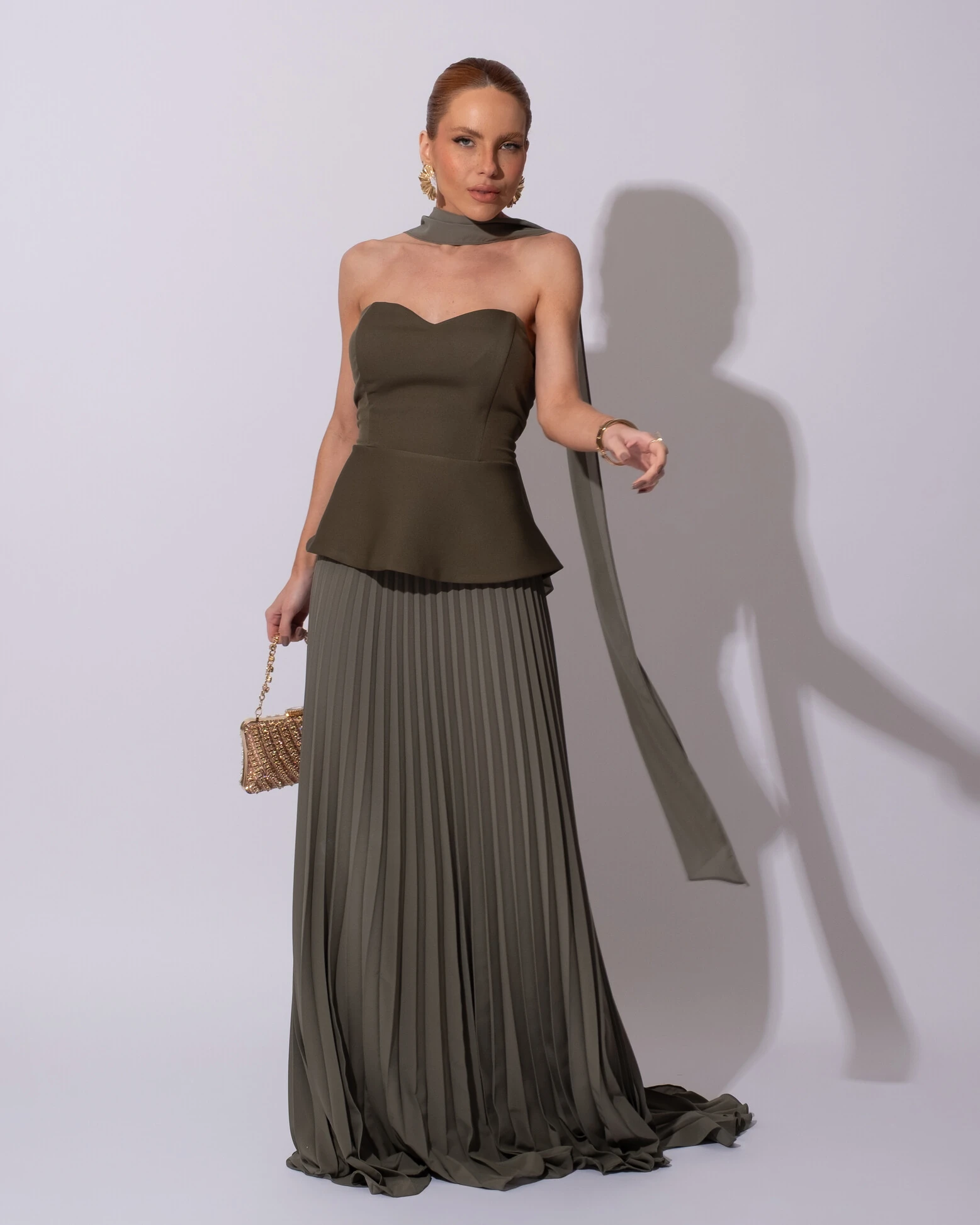 Vestido de Festa Longo Alfaiataria Tomara que Caia Saia Plissada e Lenço Verde Oliva