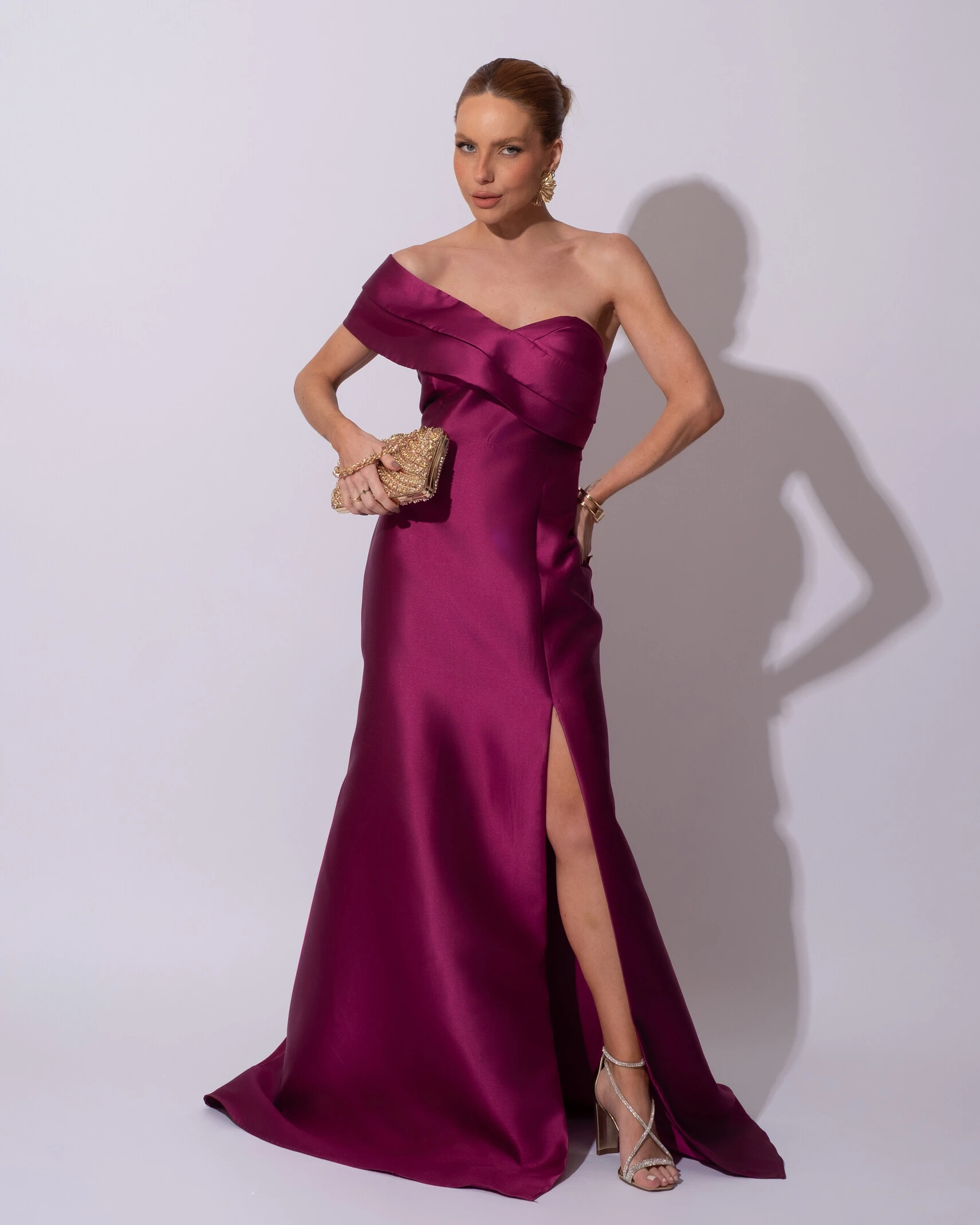 Confeccionado em zibeline, tecido nobre de toque encorpado e brilho acetinado, este vestido apresenta modelagem de um ombro só com babado estruturado que valoriza o busto e o colo de forma elegante. A cintura marcada realça a silhueta, enquanto a saia longa e fluida, com fenda frontal, traz movimento e um toque de sensualidade na medida certa. O acabamento impecável e o caimento firme do zibeline garantem um visual sofisticado e de alta costura.