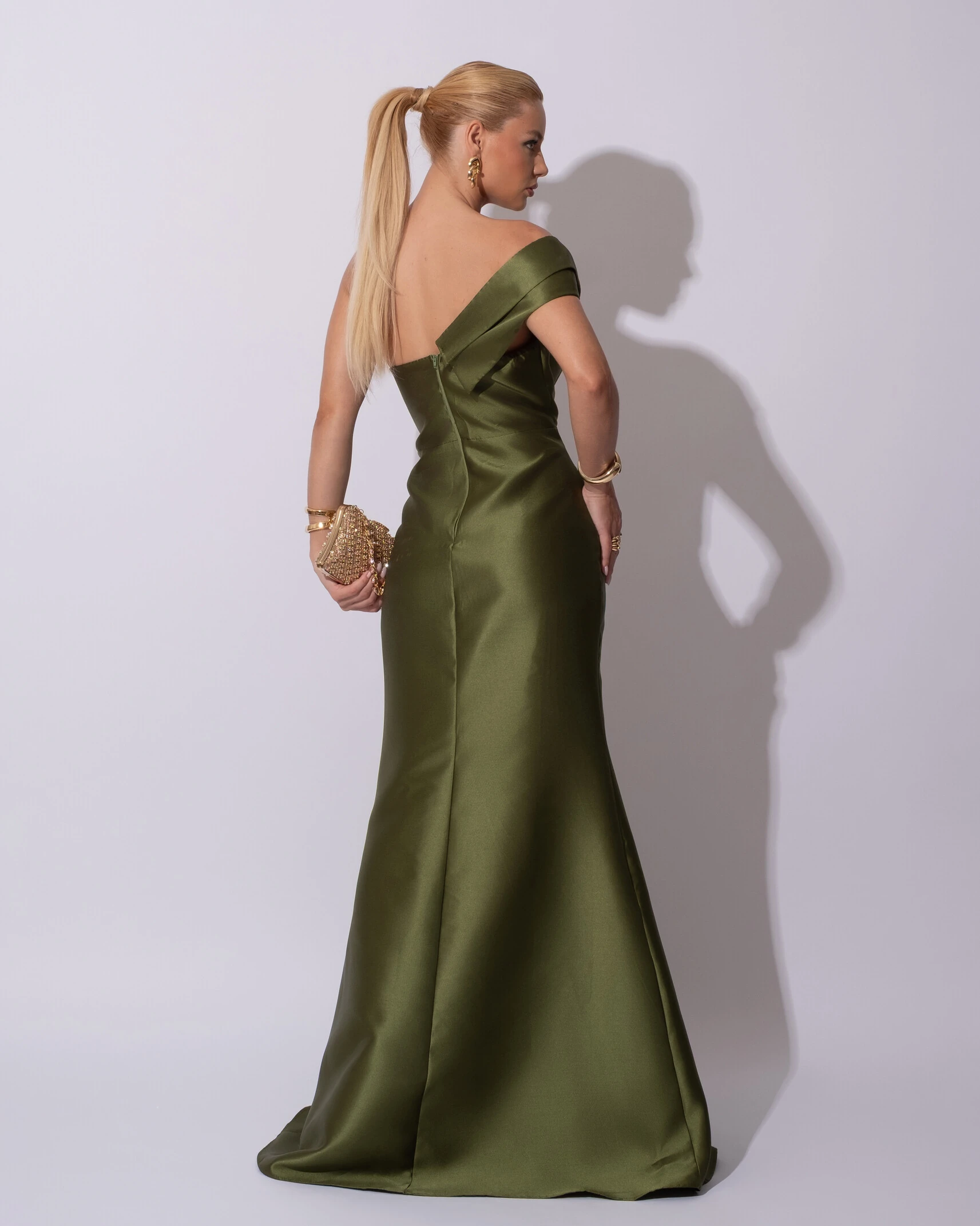 Vestido de festa Longo Zibeline Faixa Drapeada Ombro e Fenda Verde Oliva