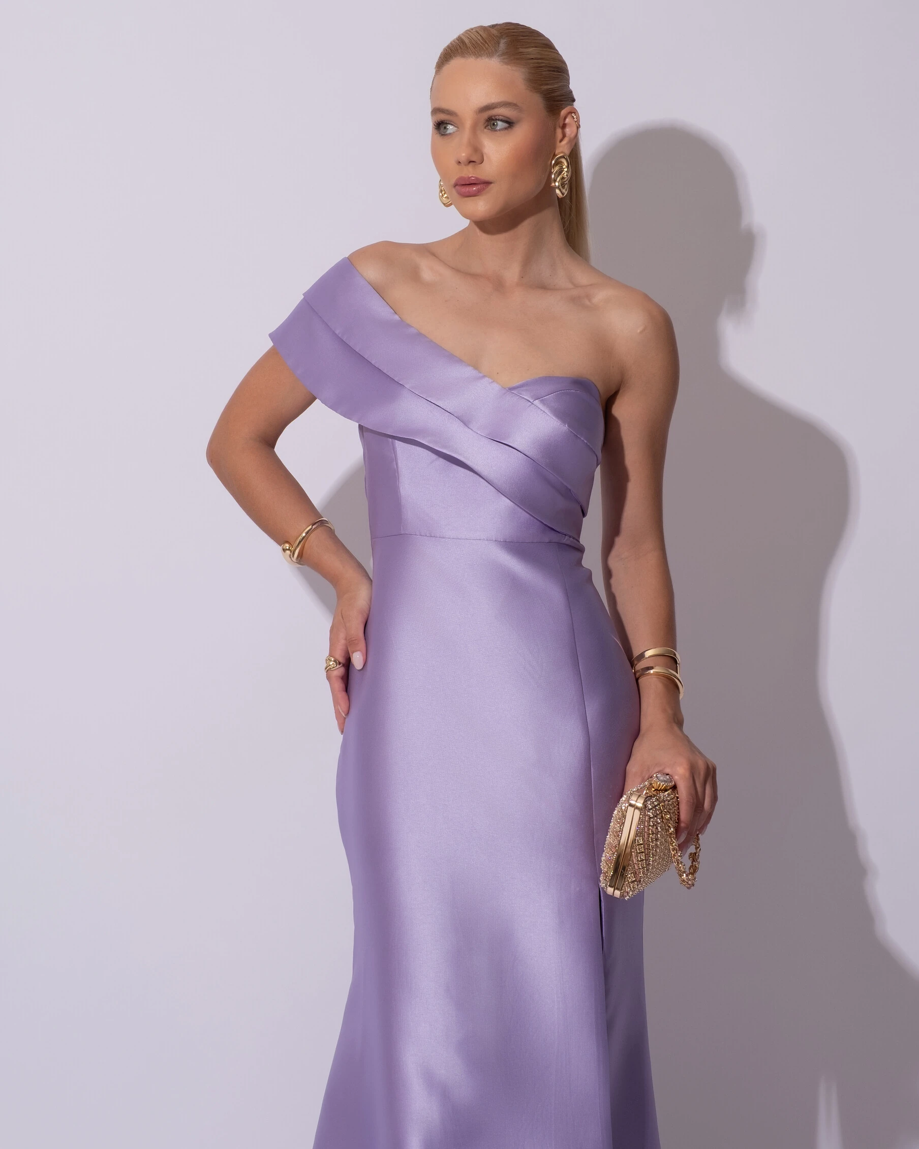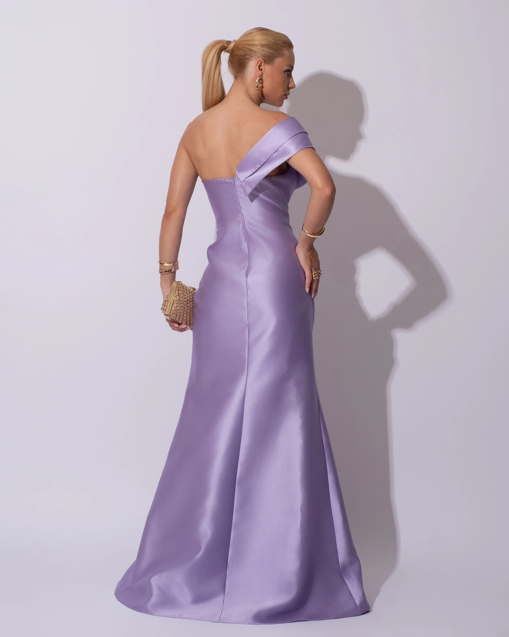 Confeccionado em zibeline, tecido nobre de toque encorpado e brilho acetinado, este vestido apresenta modelagem de um ombro só com babado estruturado que valoriza o busto e o colo de forma elegante. A cintura marcada realça a silhueta, enquanto a saia longa e fluida, com fenda frontal, traz movimento e um toque de sensualidade na medida certa. O acabamento impecável e o caimento firme do zibeline garantem um visual sofisticado e de alta costura.