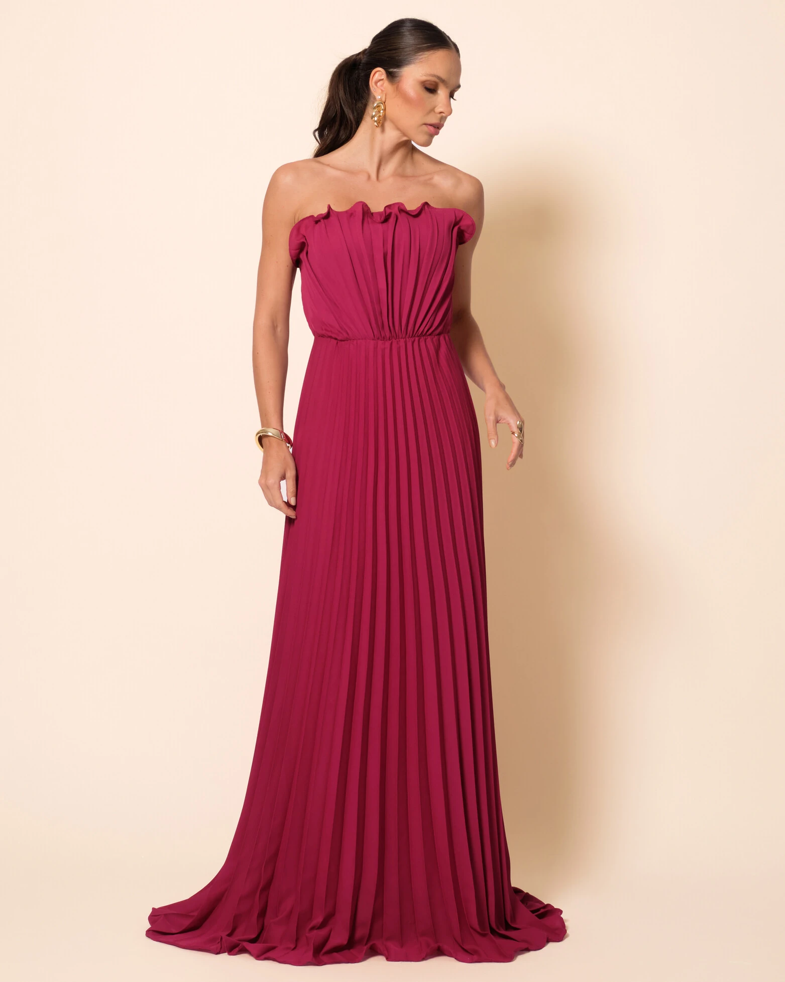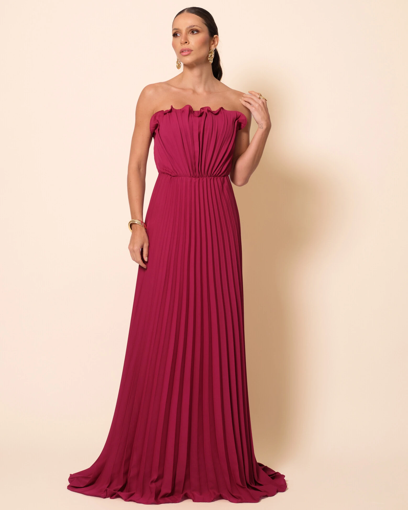 VESTIDO DE FESTA LONGO TOMARA QUE CAIA PLISSADO DETALHE - O vestido longo tomara que caia e plissado, transmite energia e elegância. O plissado dá movimento e leveza ao tecido, tornando-o perfeito para ocasiões como casamentos ao pôr do sol, formaturas, jantares elegantes ou festas de verão. Combine-o com acessórios dourados ou em tons terrosos, sandálias de salto delicado e uma clutch pequena. Um penteado preso suave e uma maquiagem iluminada completam o visual com sofisticação e frescor.