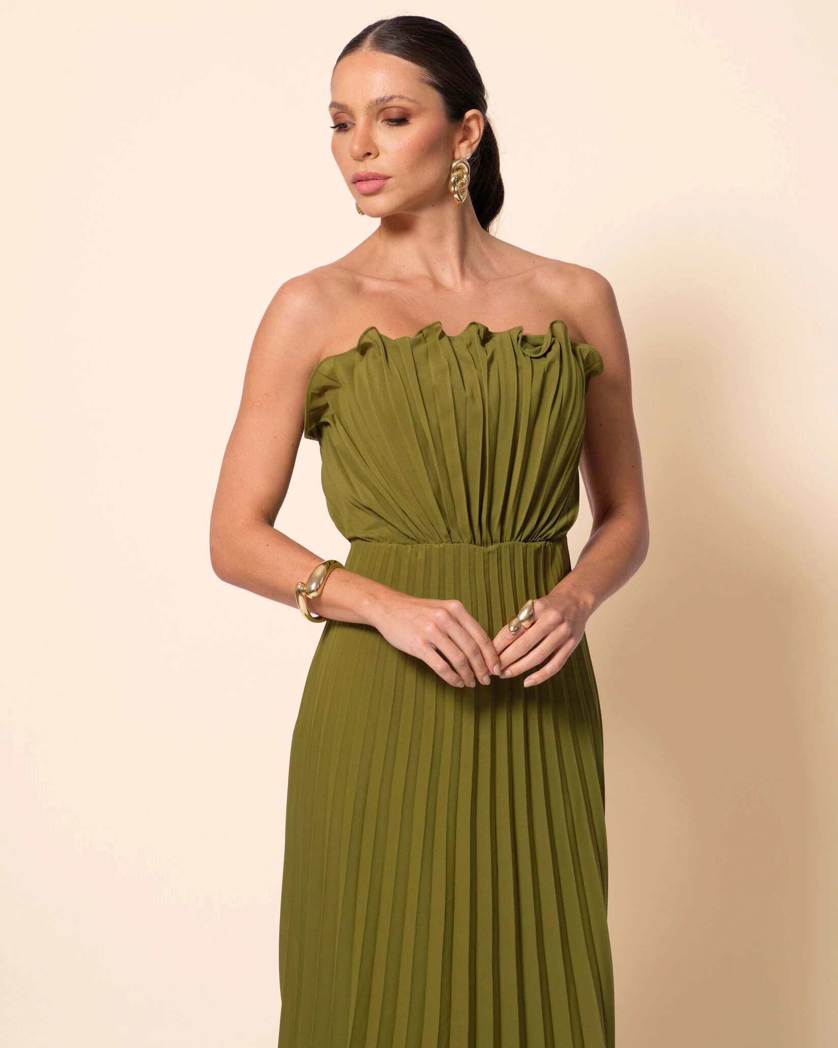 VESTIDO DE FESTA LONGO TOMARA QUE CAIA PLISSADO DETALHE - O vestido longo tomara que caia e plissado, transmite energia e elegância. O plissado dá movimento e leveza ao tecido, tornando-o perfeito para ocasiões como casamentos ao pôr do sol, formaturas, jantares elegantes ou festas de verão. Combine-o com acessórios dourados ou em tons terrosos, sandálias de salto delicado e uma clutch pequena. Um penteado preso suave e uma maquiagem iluminada completam o visual com sofisticação e frescor.