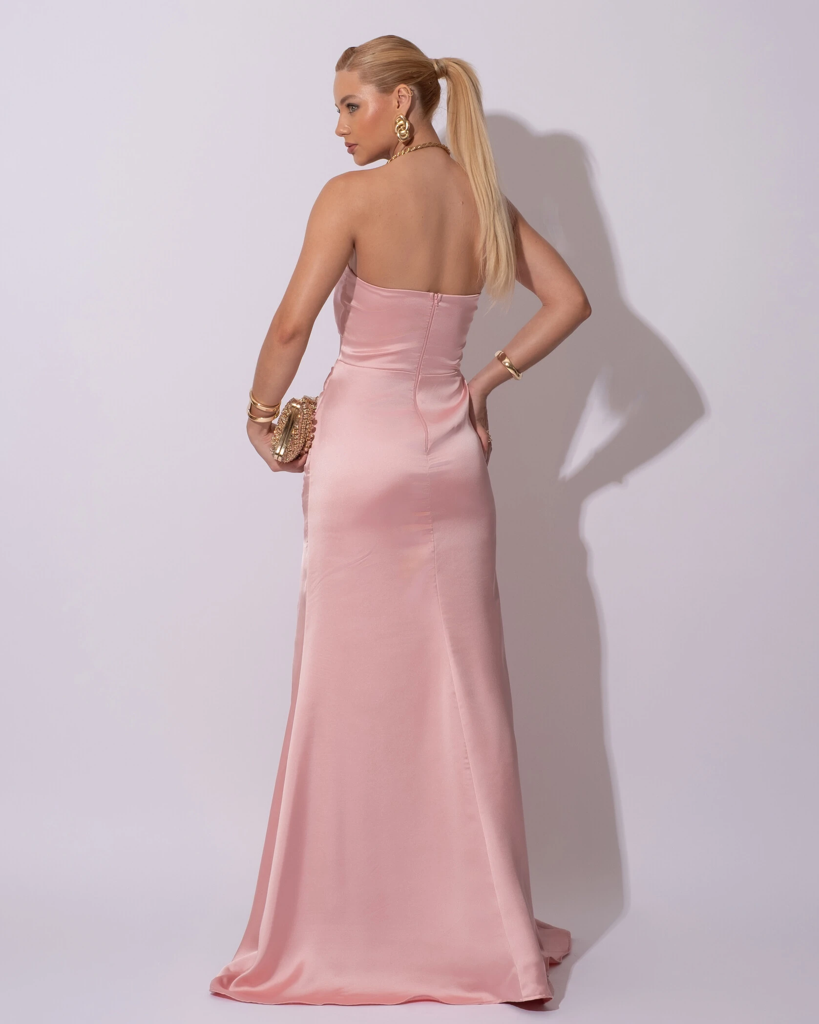 Vestido de Festa Longo Cetim Alfaiataria Tomara que Caia Fenda Rose Gold