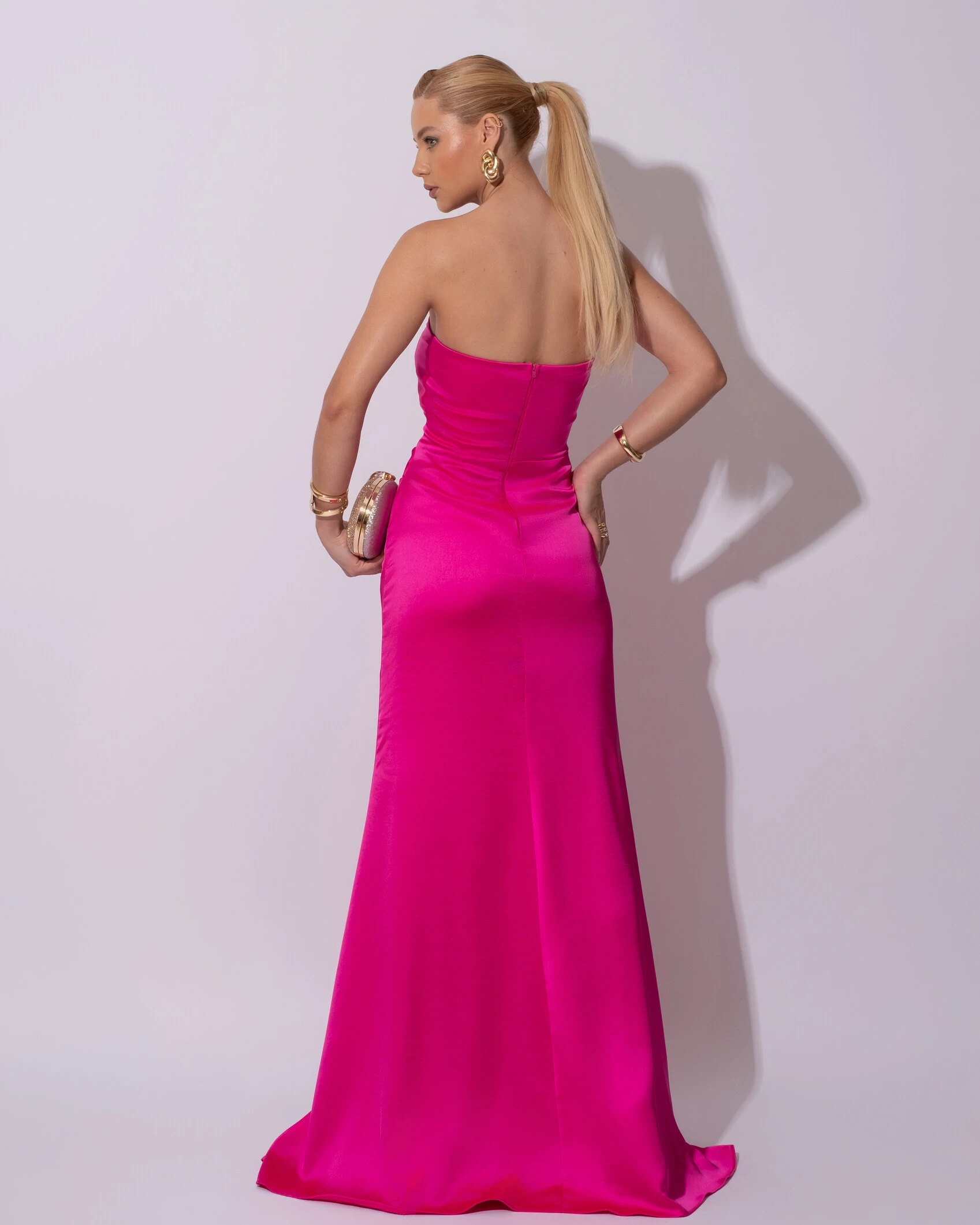 Confeccionado em cetim alfaiataria, este vestido apresenta um caimento estruturado e sofisticado que valoriza a silhueta feminina. O modelo tomara que caia destaca o colo de forma elegante, enquanto o drapeado sutil no busto adiciona textura e movimento ao design. A cintura marcada cria um efeito alongado e equilibrado, e a saia levemente ajustada com cauda fluida confere um toque de glamour e refinamento ao visual.