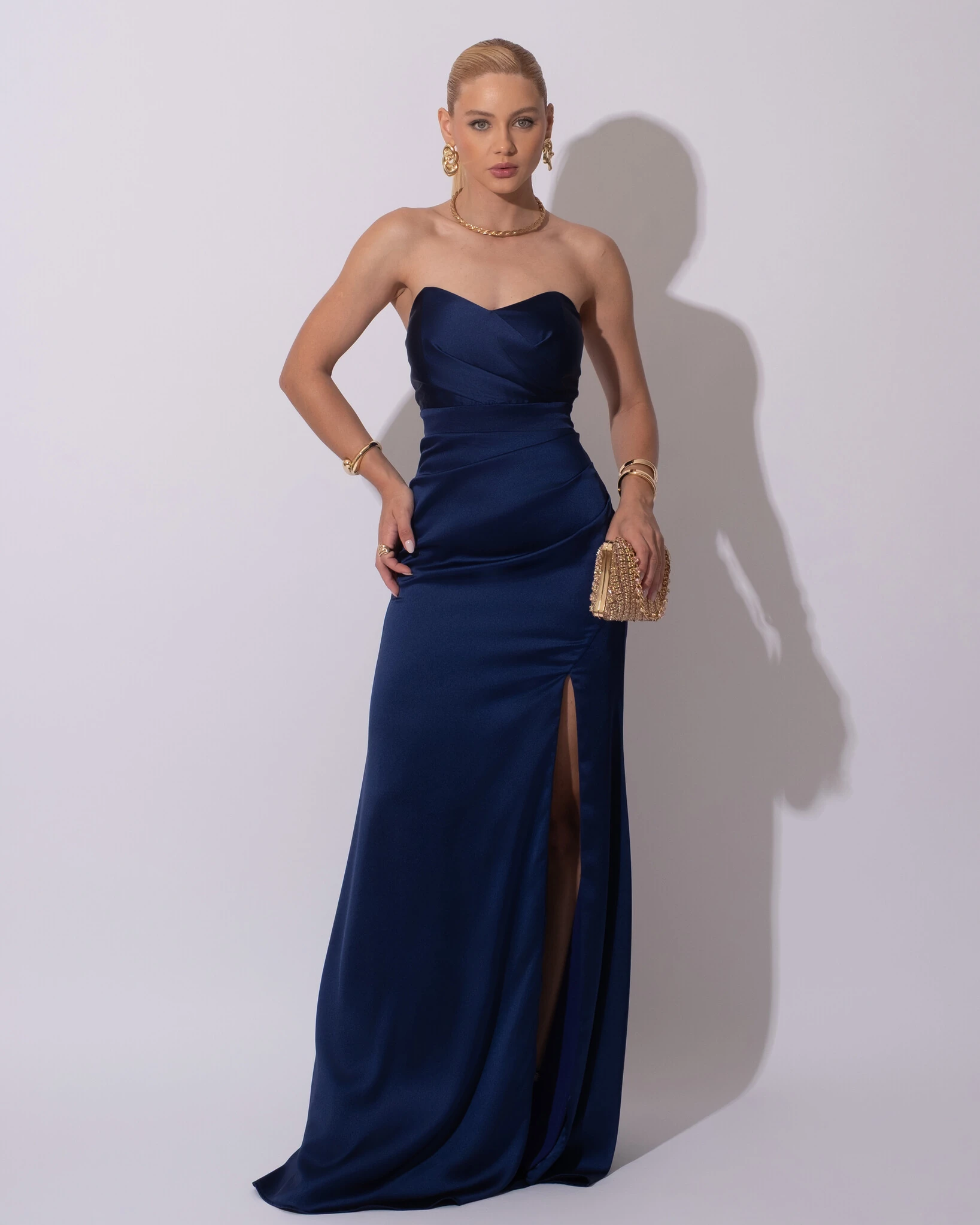 Vestido de Festa Longo Cetim Alfaiataria Tomara que Caia Fenda Azul Marinho
