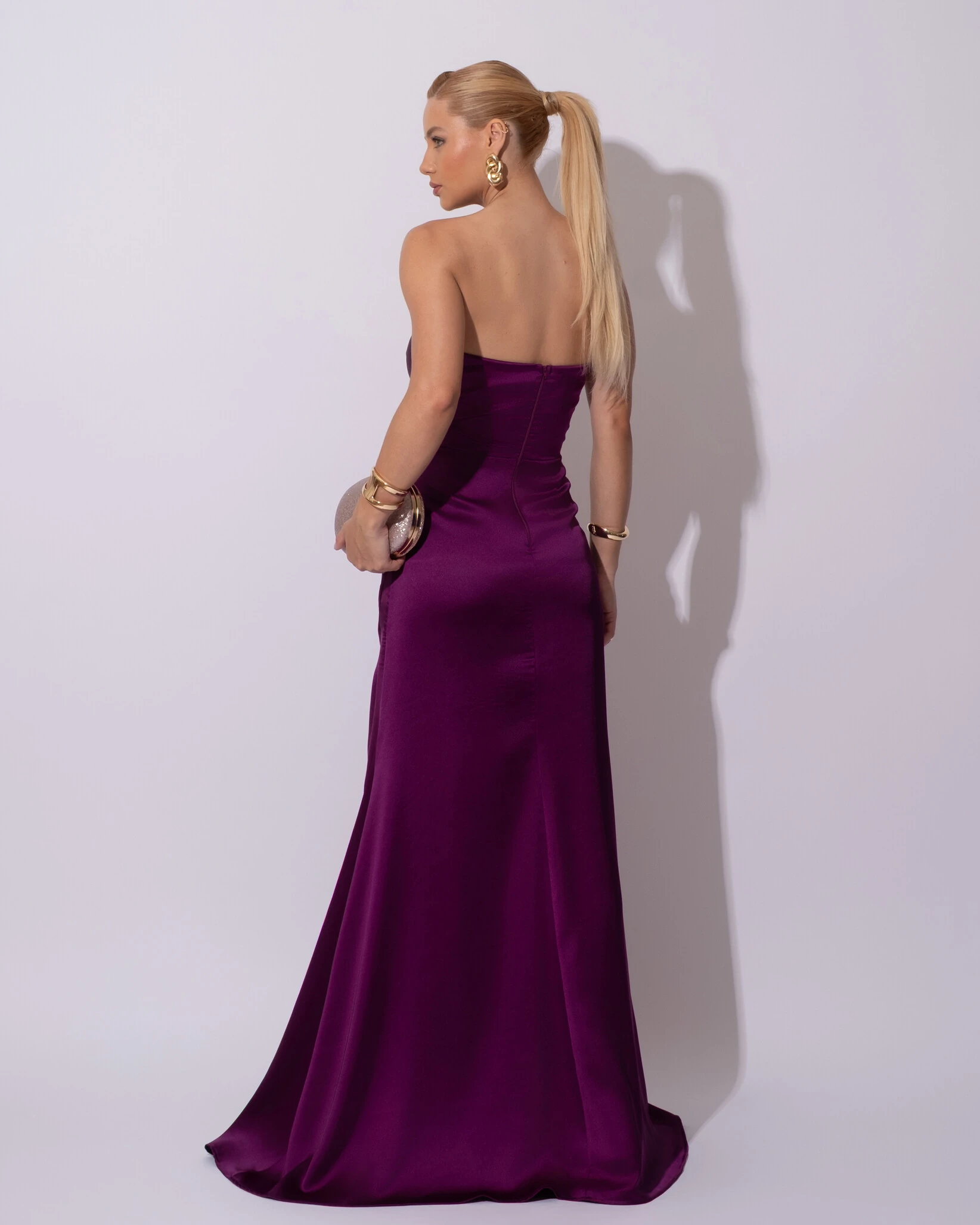 Vestido de Festa Longo Cetim Alfaiataria Tomara que Caia Fenda Roxo