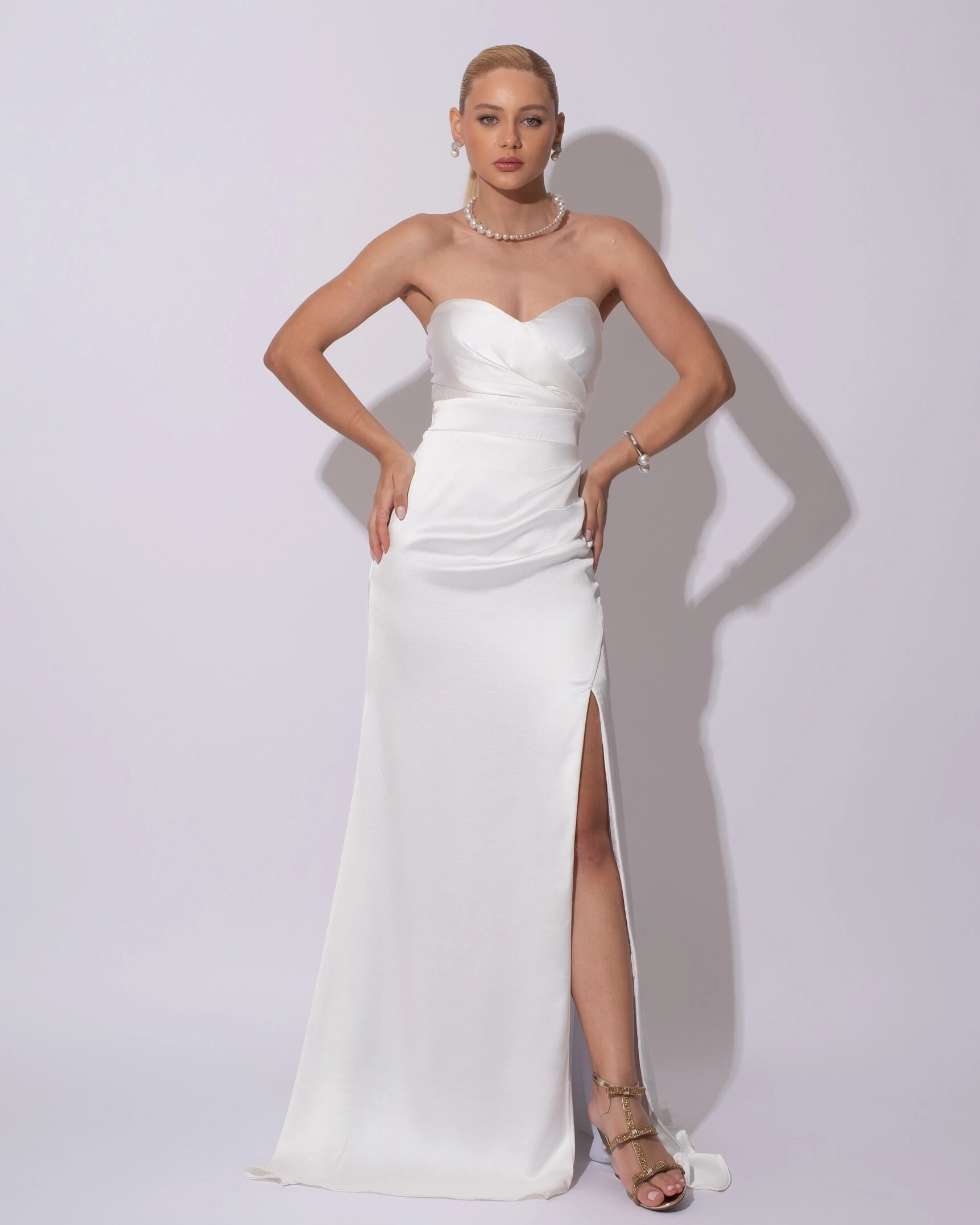Confeccionado em cetim alfaiataria, este vestido apresenta um caimento estruturado e sofisticado que valoriza a silhueta feminina. O modelo tomara que caia destaca o colo de forma elegante, enquanto o drapeado sutil no busto adiciona textura e movimento ao design. A cintura marcada cria um efeito alongado e equilibrado, e a saia levemente ajustada com cauda fluida confere um toque de glamour e refinamento ao visual.