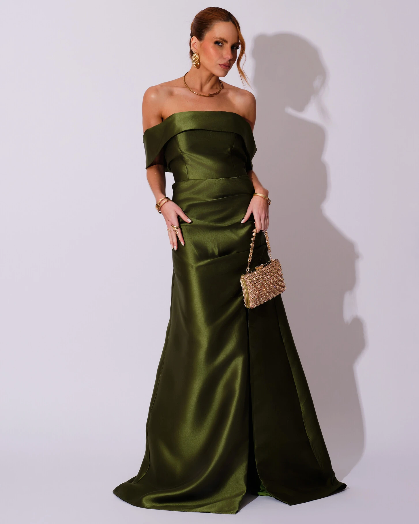 Vestido de Festa Longo Zibeline Ombro a Ombro Drapeado e Fenda Verde Oliva