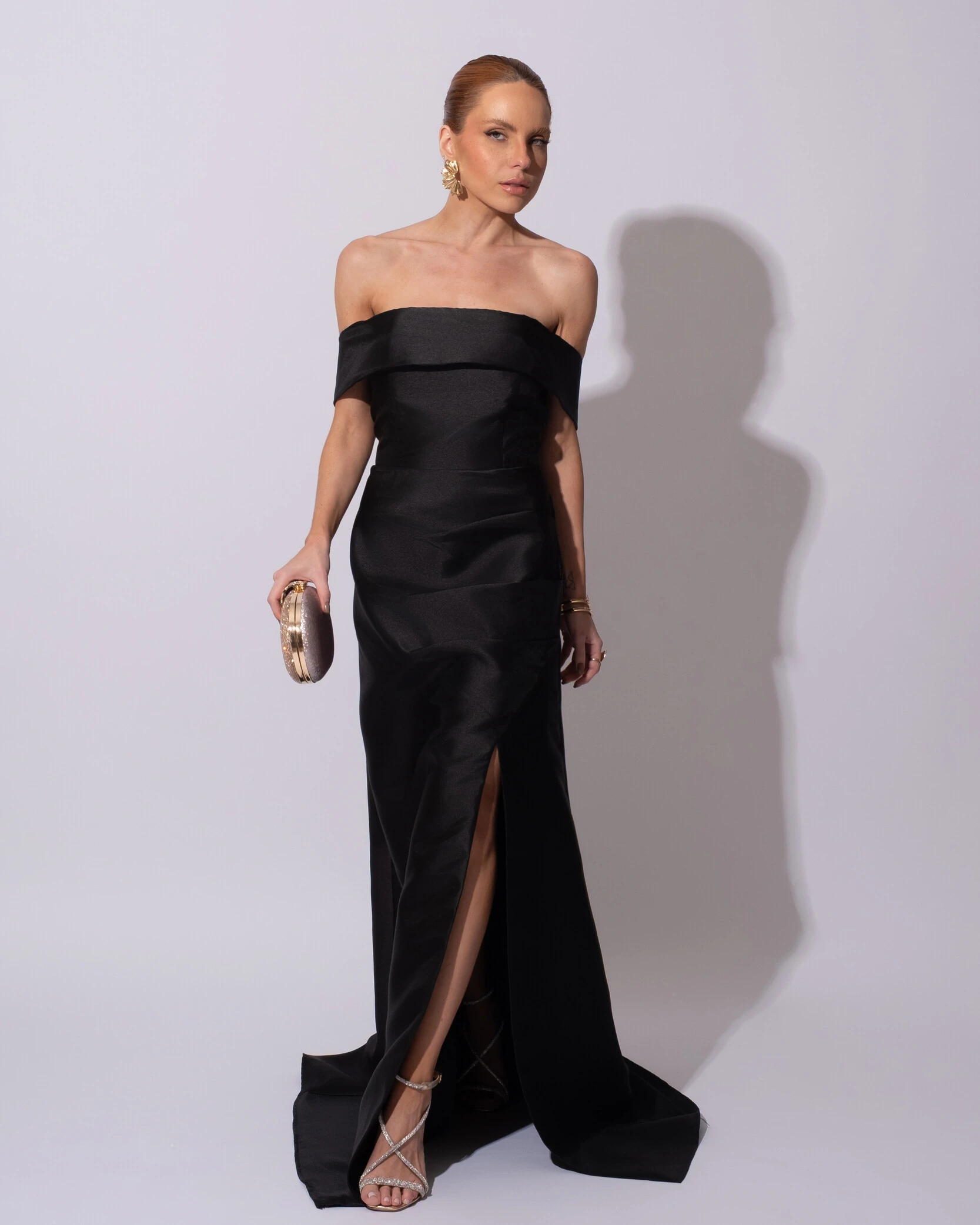 Vestido de Festa Longo Zibeline Ombro a Ombro Drapeado e Fenda Preto