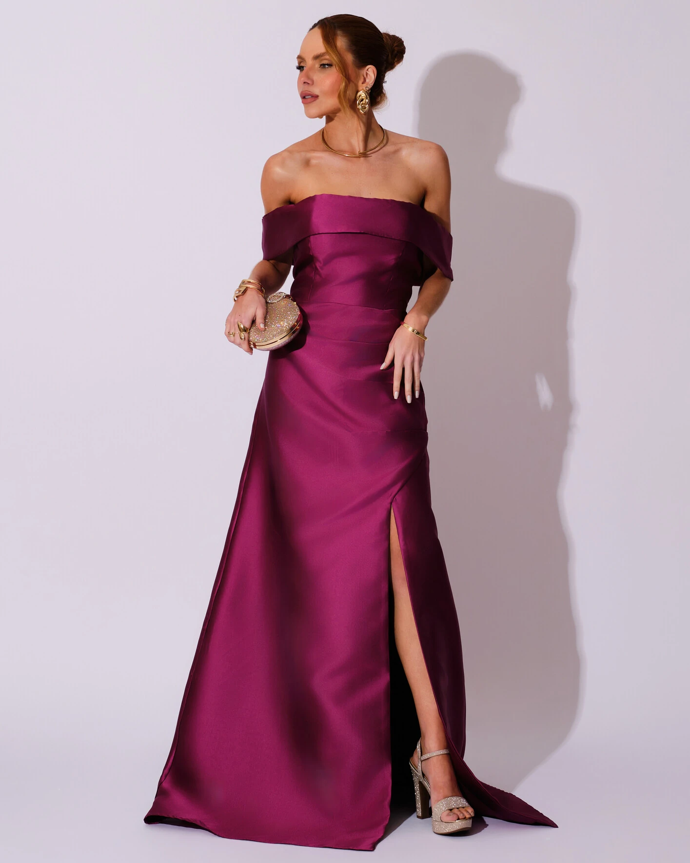 VESTIDO DE FESTA LONGO ZIBELINE OMBRO A OMBRO DRAPEADO FENDA - Este modelo ombro a ombro é puro requinte e versatilidade, ideal para ocasiões como casamentos, formaturas, jantares elegantes e eventos de gala. O decote reto valoriza o colo com sutileza, enquanto o caimento estruturado e o drapeado na saia trazem um toque de sofisticação moderna. Combine-o com brincos alongados e uma pulseira delicada, além de uma clutch pequena e um salto fino para alongar a silhueta. Em tons claros, ele transmite leveza e romantismo; já nas cores intensas ou escuras, ganha um ar marcante e glamouroso — perfeito para diferentes estilos e momentos.