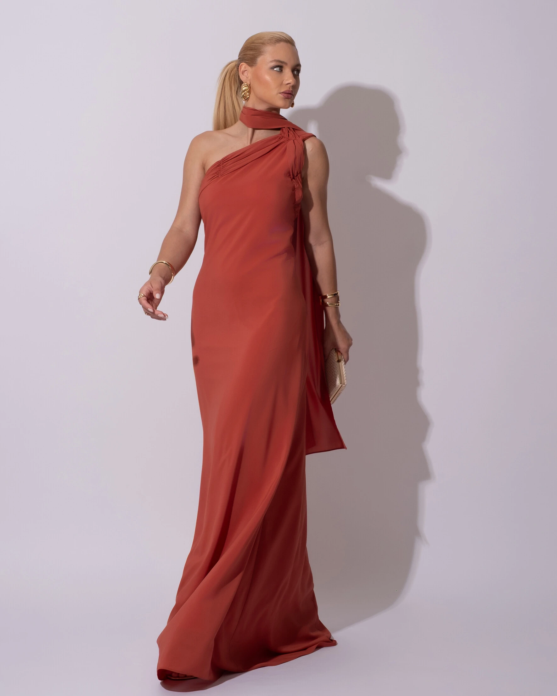 Vestido de Festa Longo Crepe Chiffon Um Ombro Só Drapeado Lenço Fixo Terracota