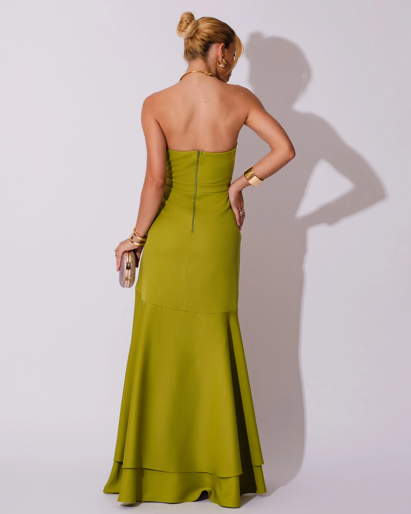 O vestido é confeccionado com um bojo estruturado que oferece suporte e modela o busto de forma delicada, proporcionando confiança e conforto ao vestir. A alfaiataria, com seu toque firme e fluido, garante um caimento impecável, enquanto a fenda em babados confere charme e dinamismo aos passos. O zíper nas costas facilita o ajuste perfeito, tornando a peça ainda mais prática. Ideal para quem busca um visual sofisticado com um toque moderno e atrevido.