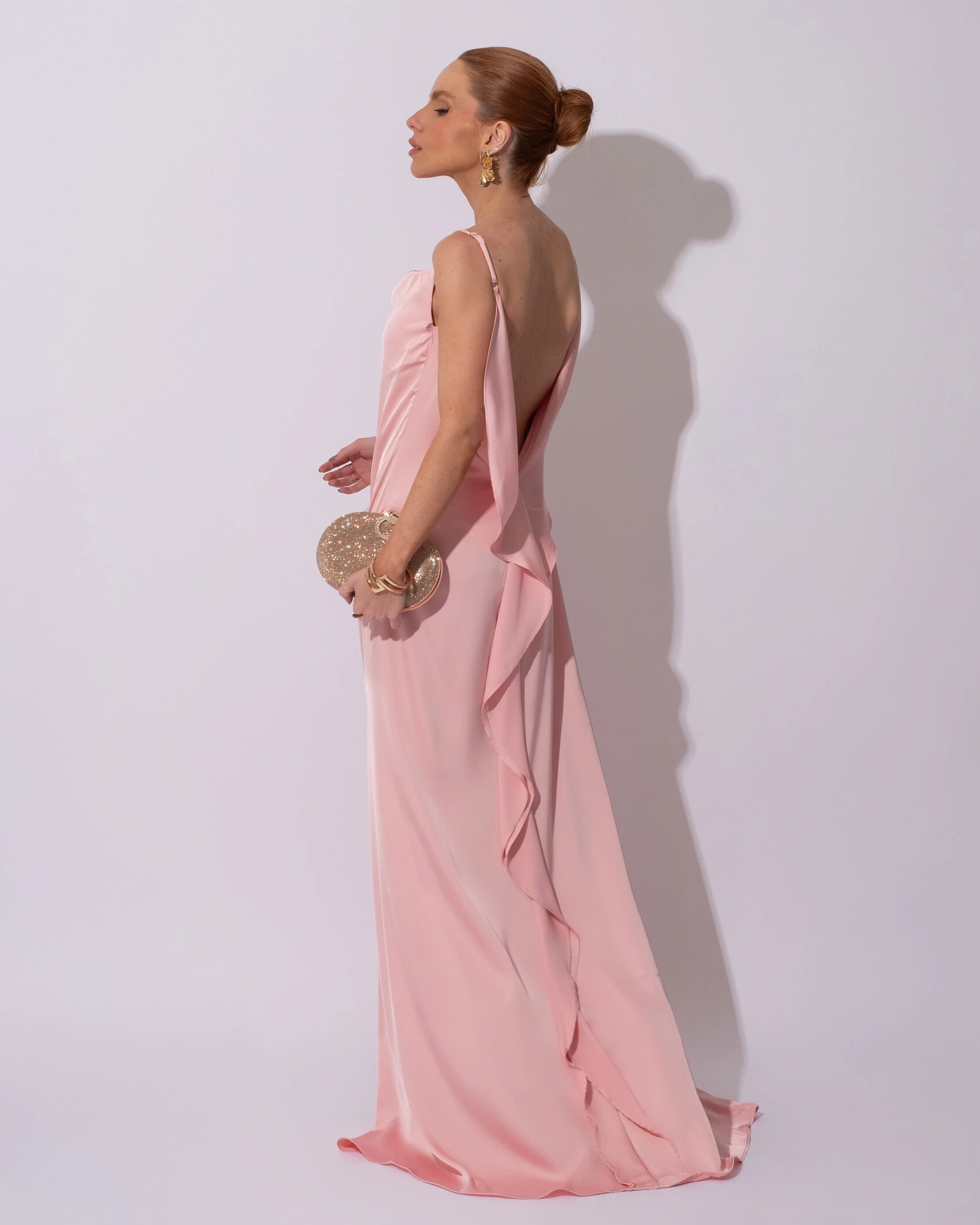 Vestido de Festa Longo Babado Costas Cetim Fluido e Fenda Rose Gold