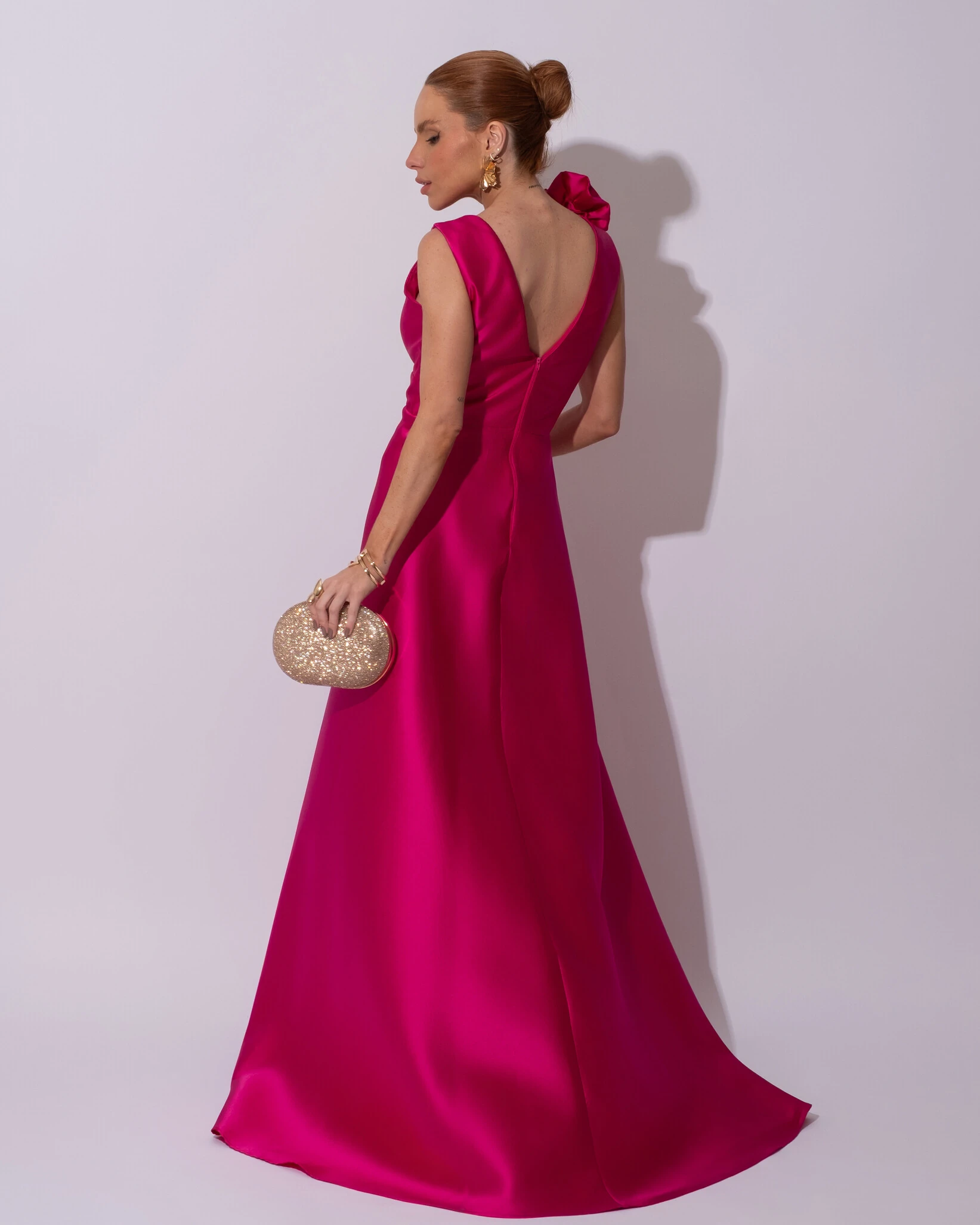 Vestido de Festa longo Zibeline Decote em V com Flores Removivel Pink