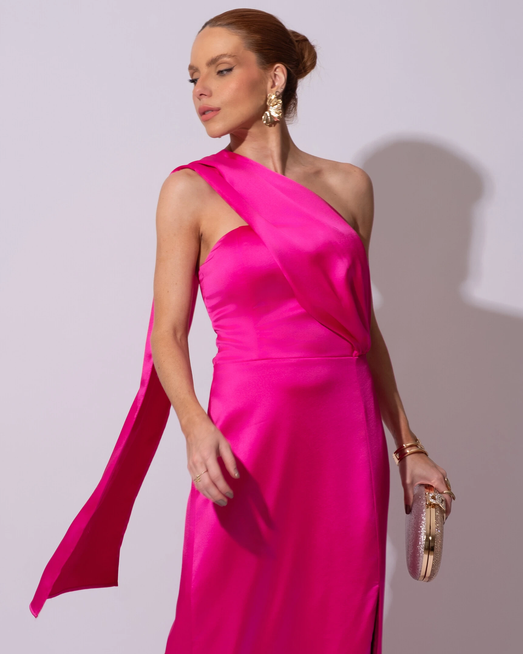 Confeccionado em cetim alfaiataria, o modelo apresenta estrutura elegante e caimento impecável que valoriza a silhueta. Possui design ajustado ao corpo, com detalhe de lenço agrupado na altura da cintura que pode ser usado de diferentes formas, conferindo versatilidade e charme à peça. O tecido acetinado traz brilho sutil e um toque sofisticado, ideal para composições refinadas.
