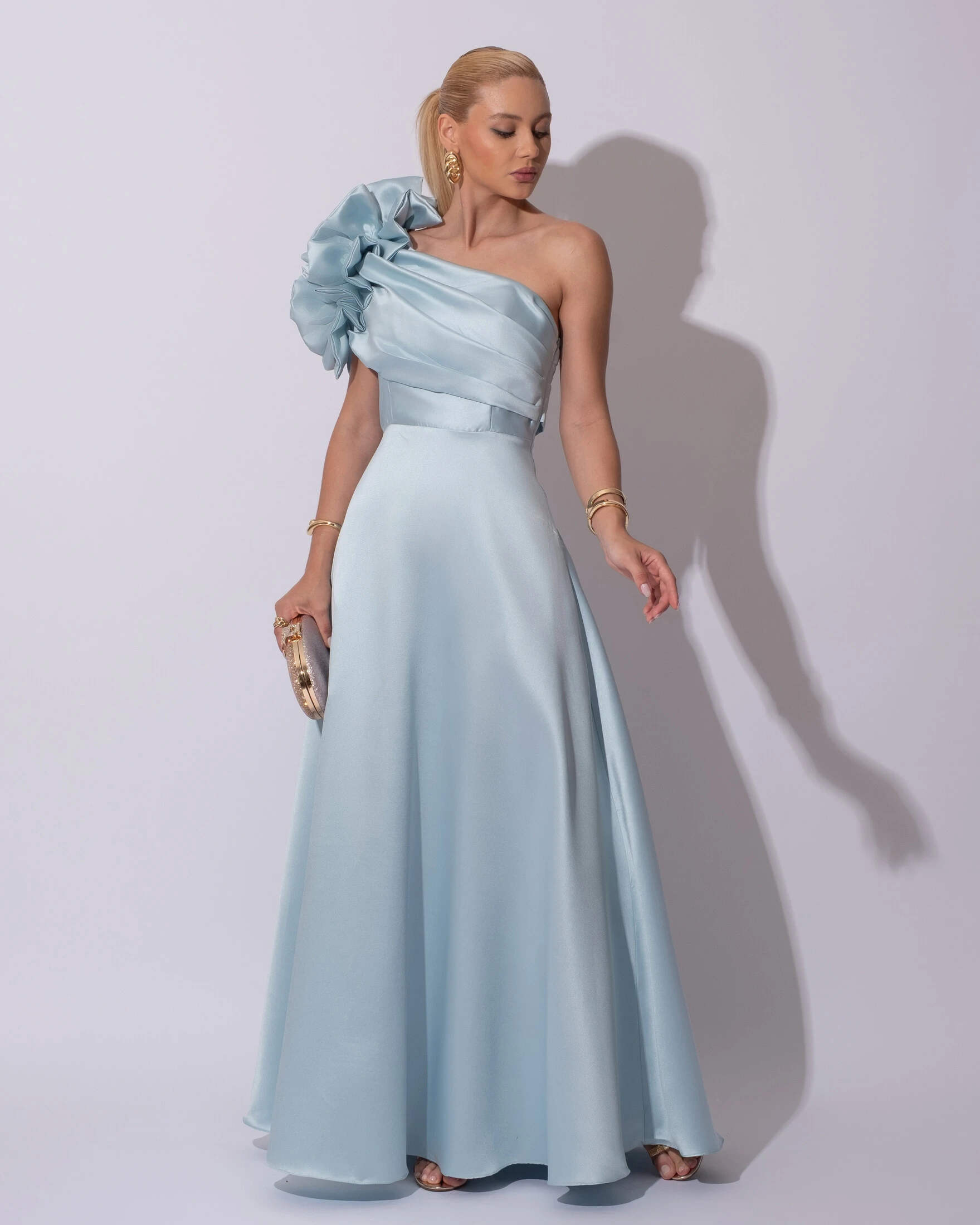 O vestido é confeccionado em zibeline, tecido conhecido pela estrutura firme e brilho sofisticado, garantindo caimento impecável. Possui modelagem um ombro só, destacada por uma flor volumosa e escultural aplicada no ombro, que cria um ponto focal elegante. O corpete é limpo e bem estruturado, enquanto a saia longa apresenta fluidez controlada, formando ondas suaves conforme o movimento. O acabamento acetinado do zibeline realça a sofisticação da peça sem pesar na silhueta.