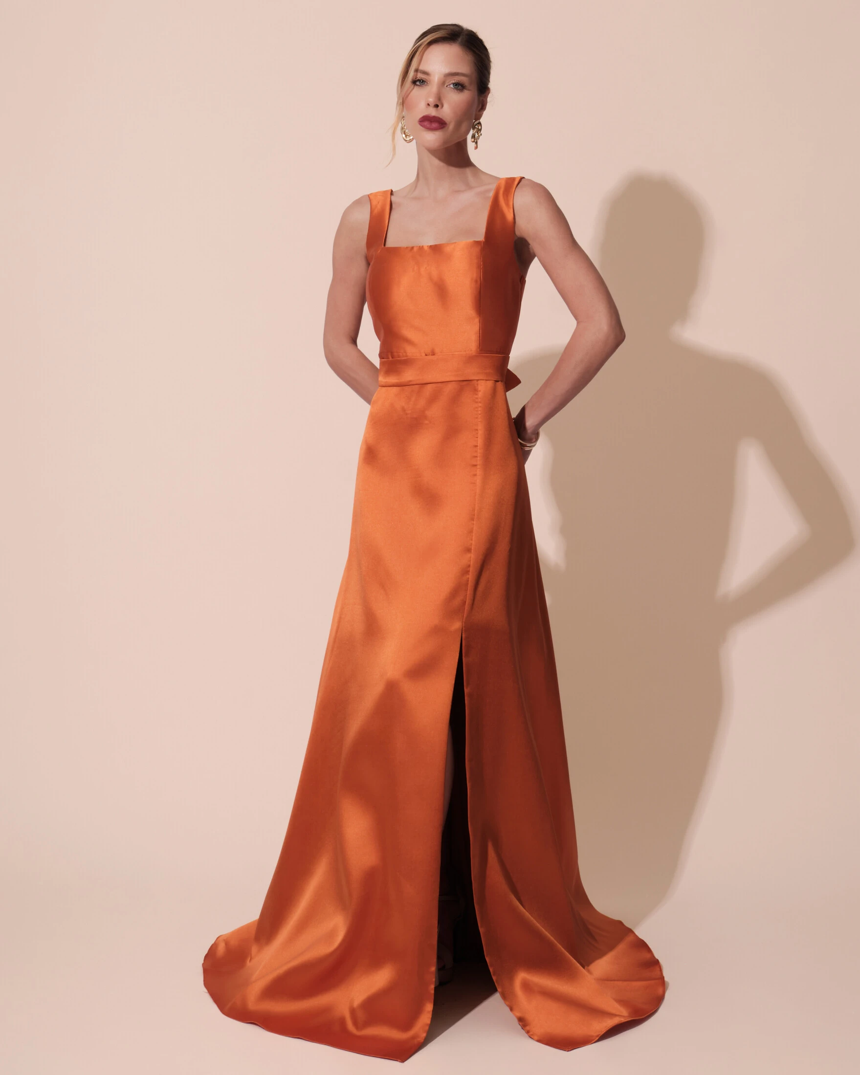 Vestido de Festa Longo Zibeline com Fenda e Faixa Terracota