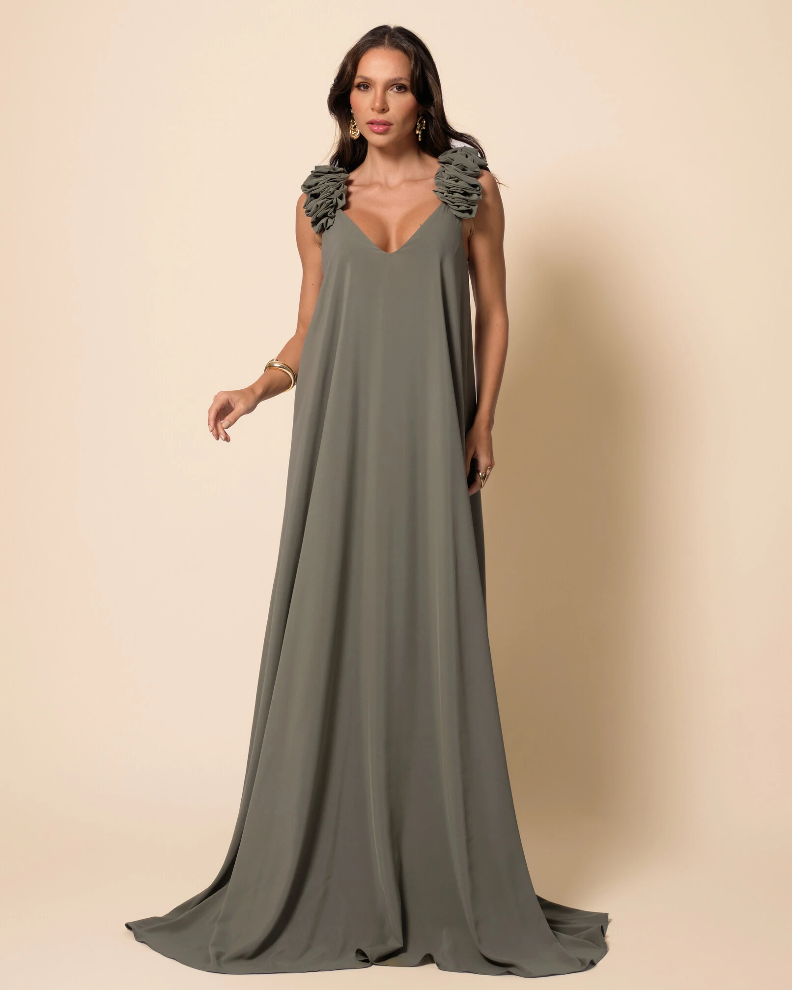 O vestido apresenta um decote em V elegante que alonga a silhueta, acompanhado por alças enriquecidas com flores estruturadas em camadas, criando um ponto de destaque cheio de volume e feminilidade. A peça possui caimento fluido, com a saia longa em crepe formando ondas suaves que se movimentam com leveza. O design é reto e sofisticado, mantendo linhas limpas que valorizam o movimento natural do tecido.