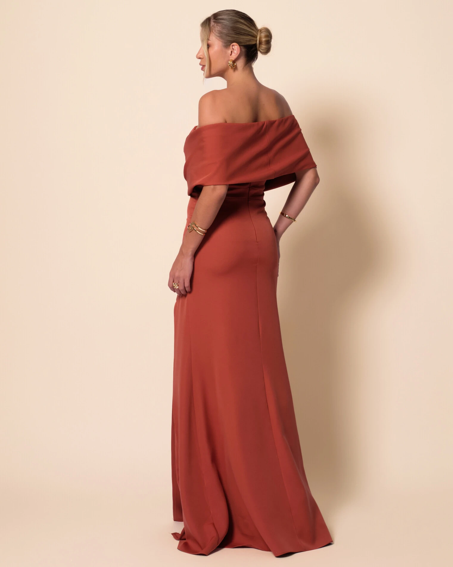 Vestido de Festa Longo Alfaiataria Ombro a Ombro Laço e Fenda Terracota