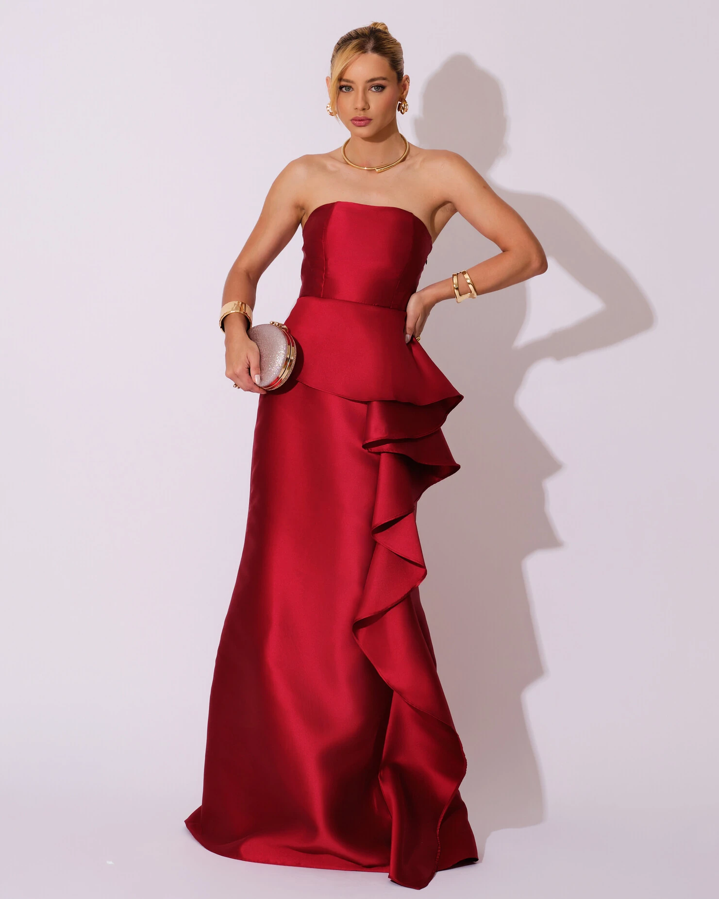 O vestido, confeccionado em zibeline, apresenta um tomara que caia estruturado que modela o busto com elegância, seguido por um delicado peplum que realça a cintura e cria um efeito de sofisticação; a saia longa e limpa ganha destaque com um babado lateral em camadas, que acrescenta volume, movimento e um toque escultural ao visual, valorizando a silhueta de forma moderna e refinada.