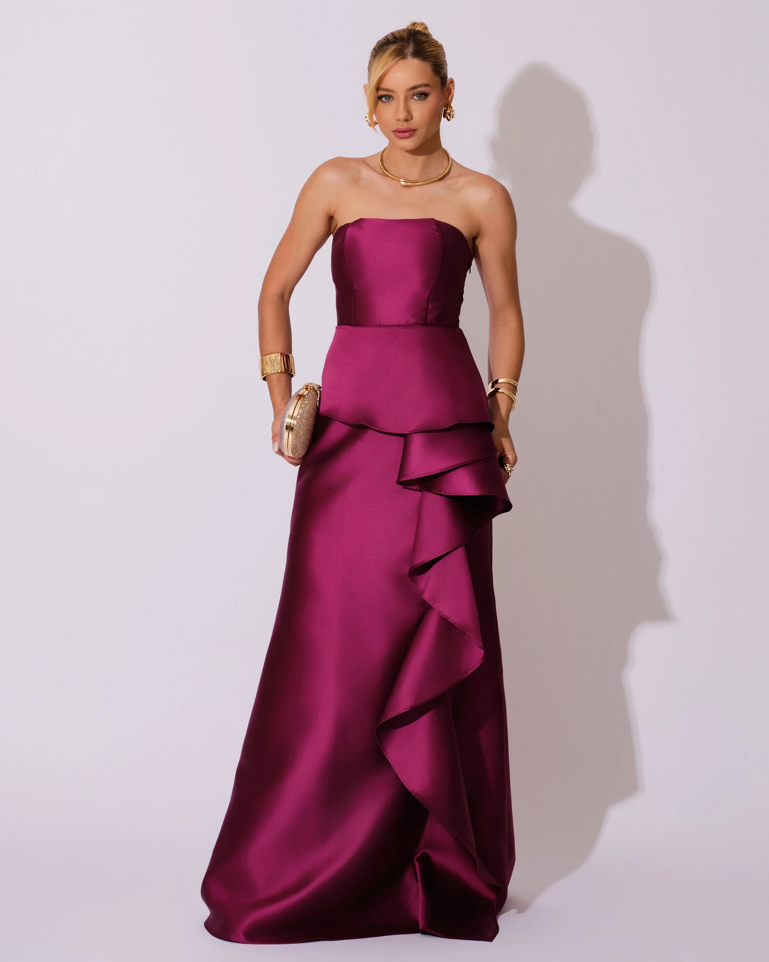 VESTIDO DE FESTA LONGO TOMARA QUE CAIA BABADO CASCATA - Este vestido longo de modelagem elegante traz um caimento sofisticado com decote tomara que caia estruturado e um peplum suave que destaca a cintura, enquanto o babado lateral em camadas adiciona movimento e charme ao look; ele combina perfeitamente com acessórios minimalistas como brincos alongados, pulseira delicada e uma clutch metálica, podendo ser usado com sandálias finas para eventos como casamentos ao ar livre, formaturas, jantares especiais ou festas de gala que pedem uma produção refinada e feminina.