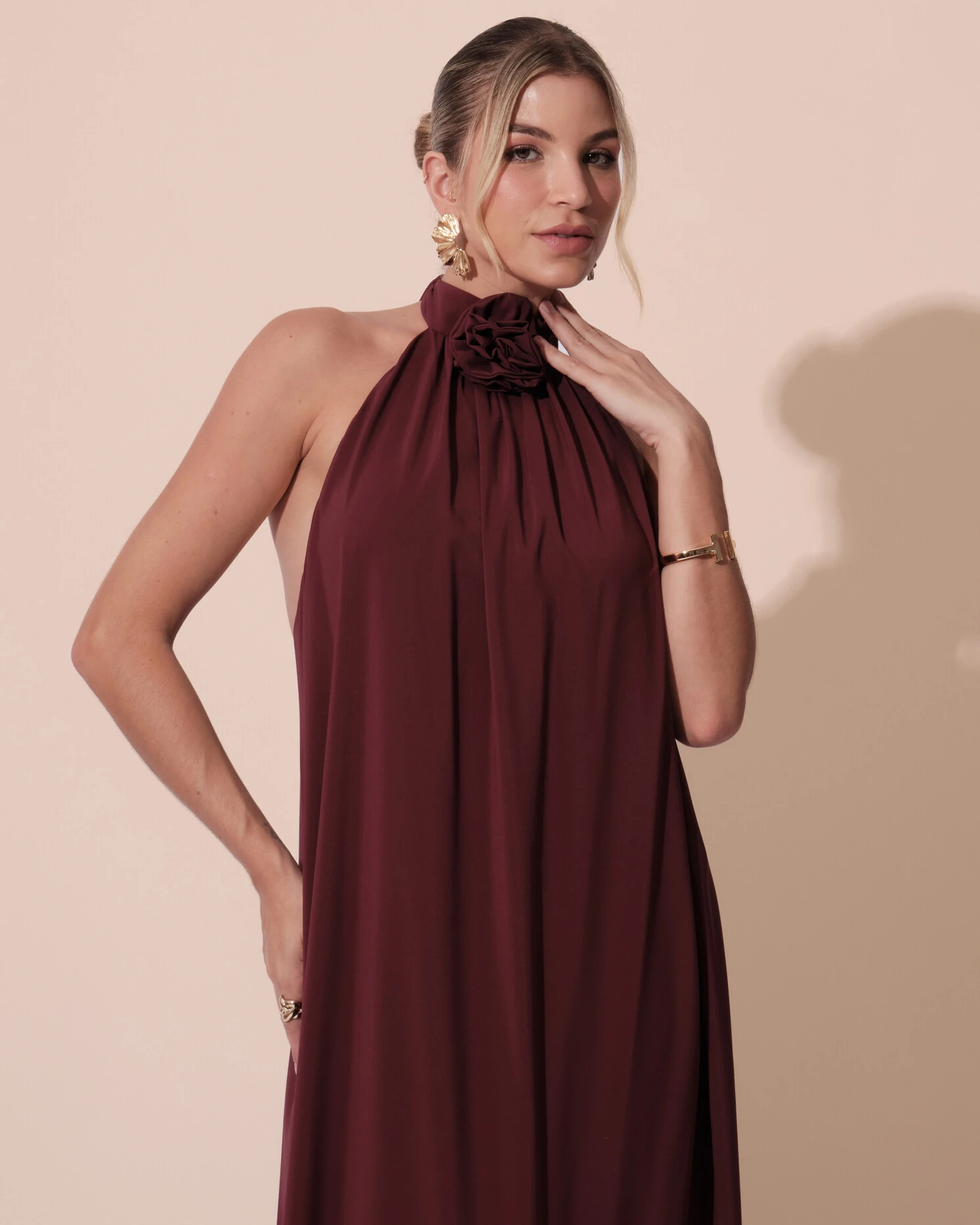 Confeccionado em tecido leve com caimento reto e elegante. Possui modelagem halter com gola alta adornada por uma delicada flor aplicada, que traz um toque romântico e sofisticado ao design minimalista. A parte frontal tem leves franzidos na base da gola, proporcionando fluidez ao caimento. Nas costas, o vestido é totalmente aberto, deixando-as à mostra e criando um contraste marcante com a frente mais fechada. A saia longa desce solta até o chão, garantindo movimento leve e uma silhueta alongada.