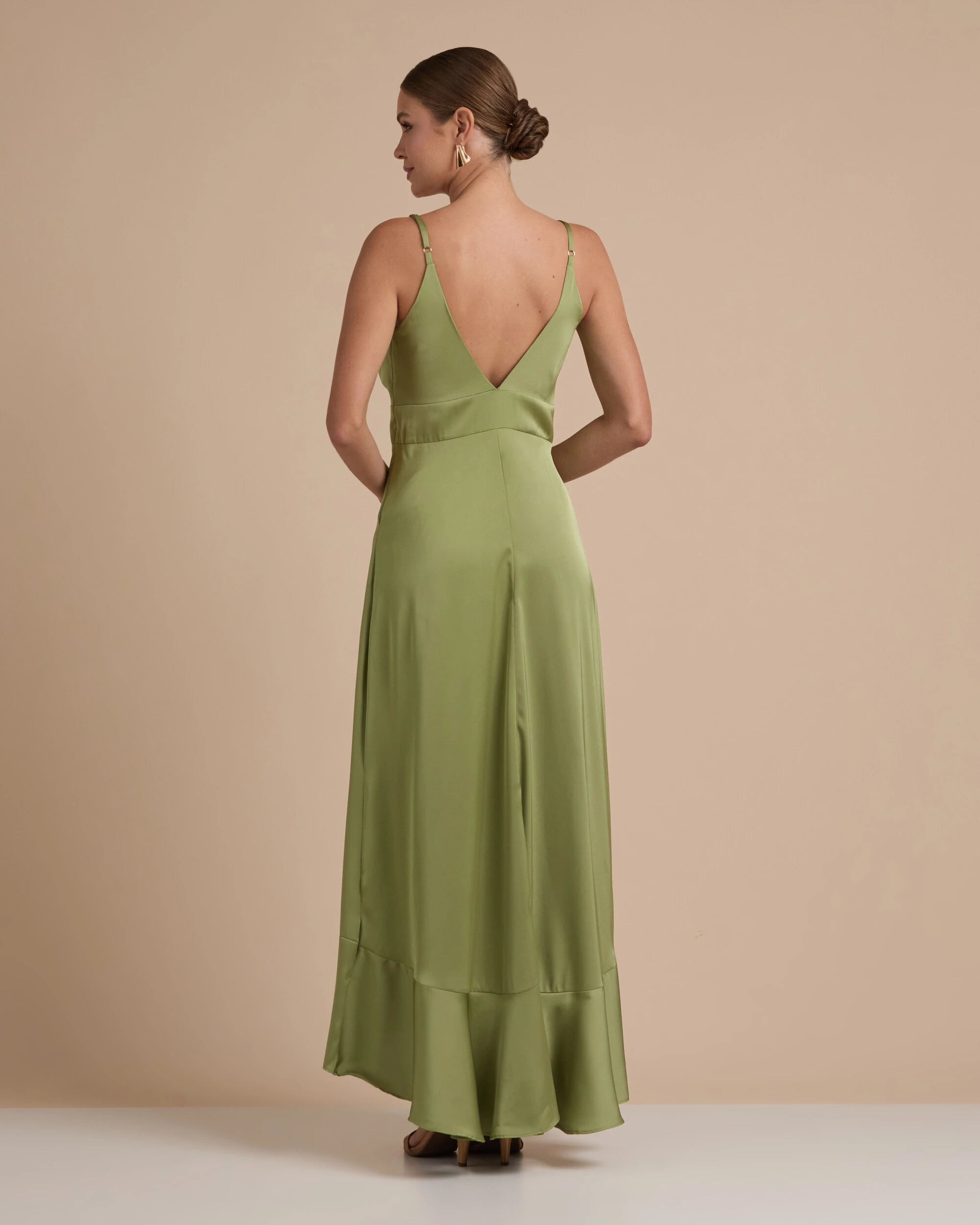 Um vestido de alças finas com um babado na sua fenda que é a partir da cintura e cruza o corpo ao fim, trazendo um acabamento sobreposto na sua barra!