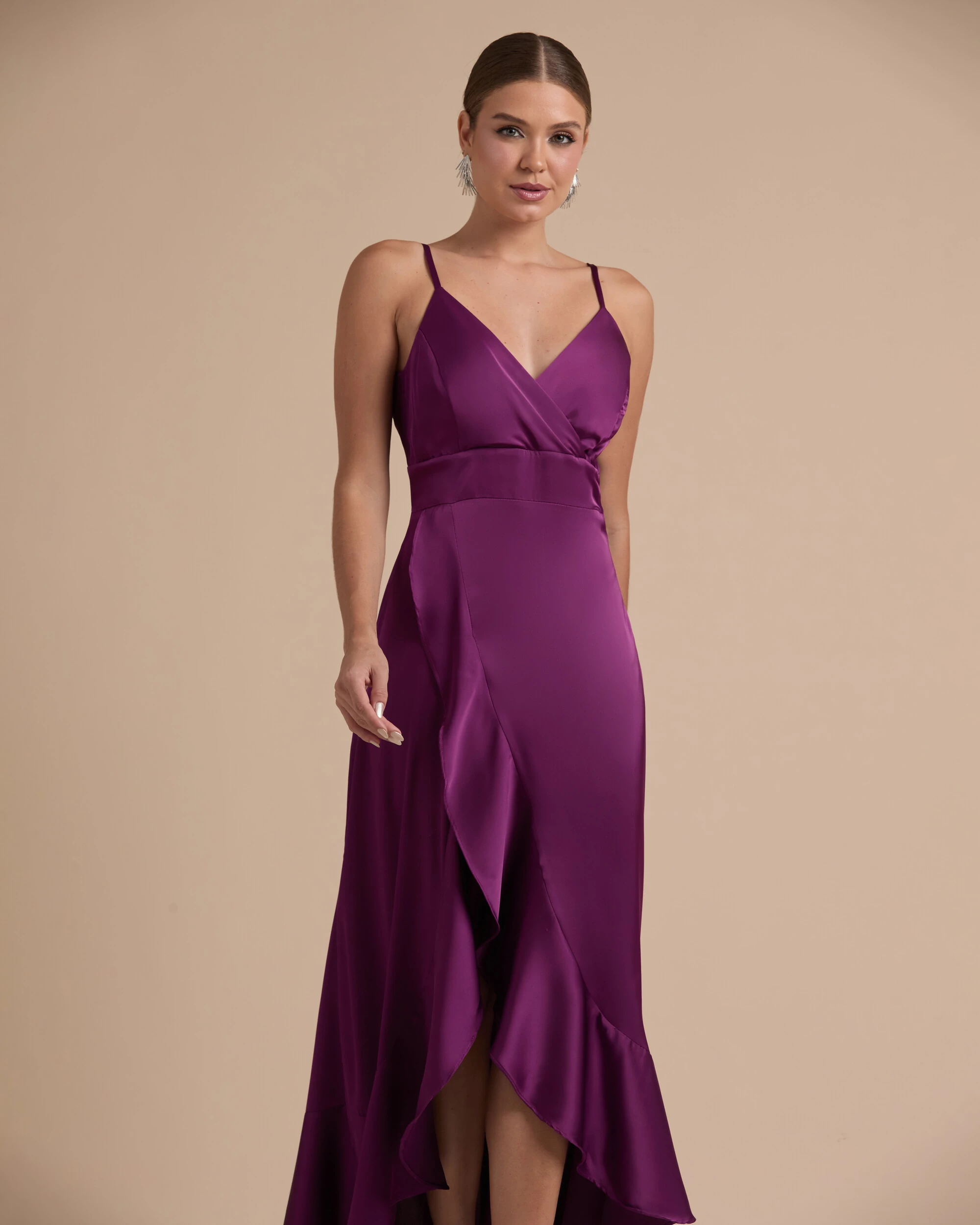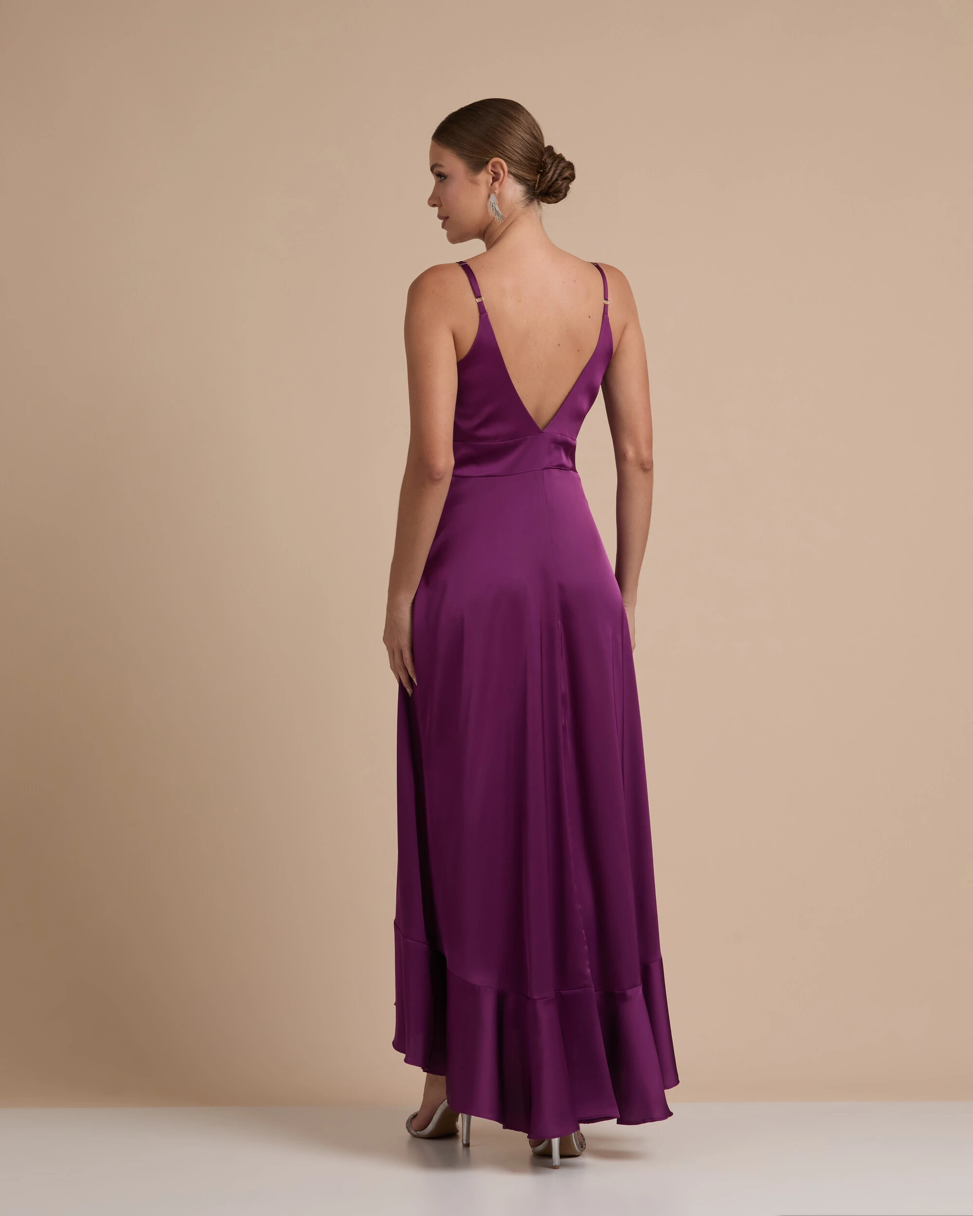 Vestido Midi Babado Acetinado Roxo