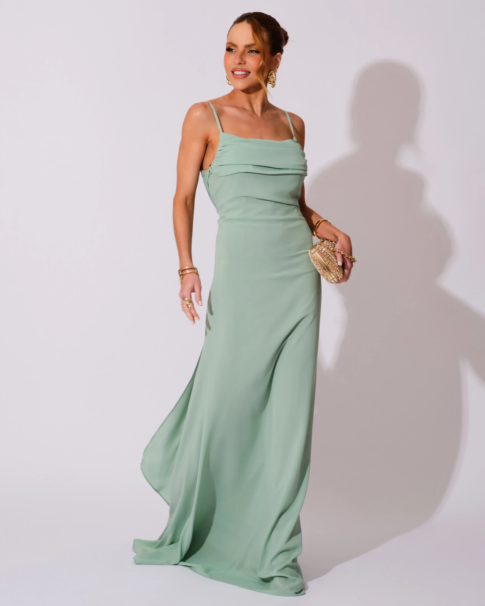 VESTIDO DE FESTA LONGO CREPE CHIFFON COSTAS LENÇO CAUDA  - Este vestido longo traz um caimento elegante e minimalista, destacando o colo com alças finas e um decote delicadamente drapeado, enquanto a parte de trás revela um visual mais aberto e sofisticado. Para complementar, acessórios prateados ou dourados delicados, como brincos alongados e uma pulseira fina, criam um equilíbrio perfeito sem tirar o protagonismo da peça; já a escolha de uma clutch estruturada e sandálias de salto fino reforça a proposta refinada. Ideal para casamentos ao ar livre, formaturas, jantares especiais ou eventos sociais que pedem um look elegante, ele combina leveza e presença de forma impecável.