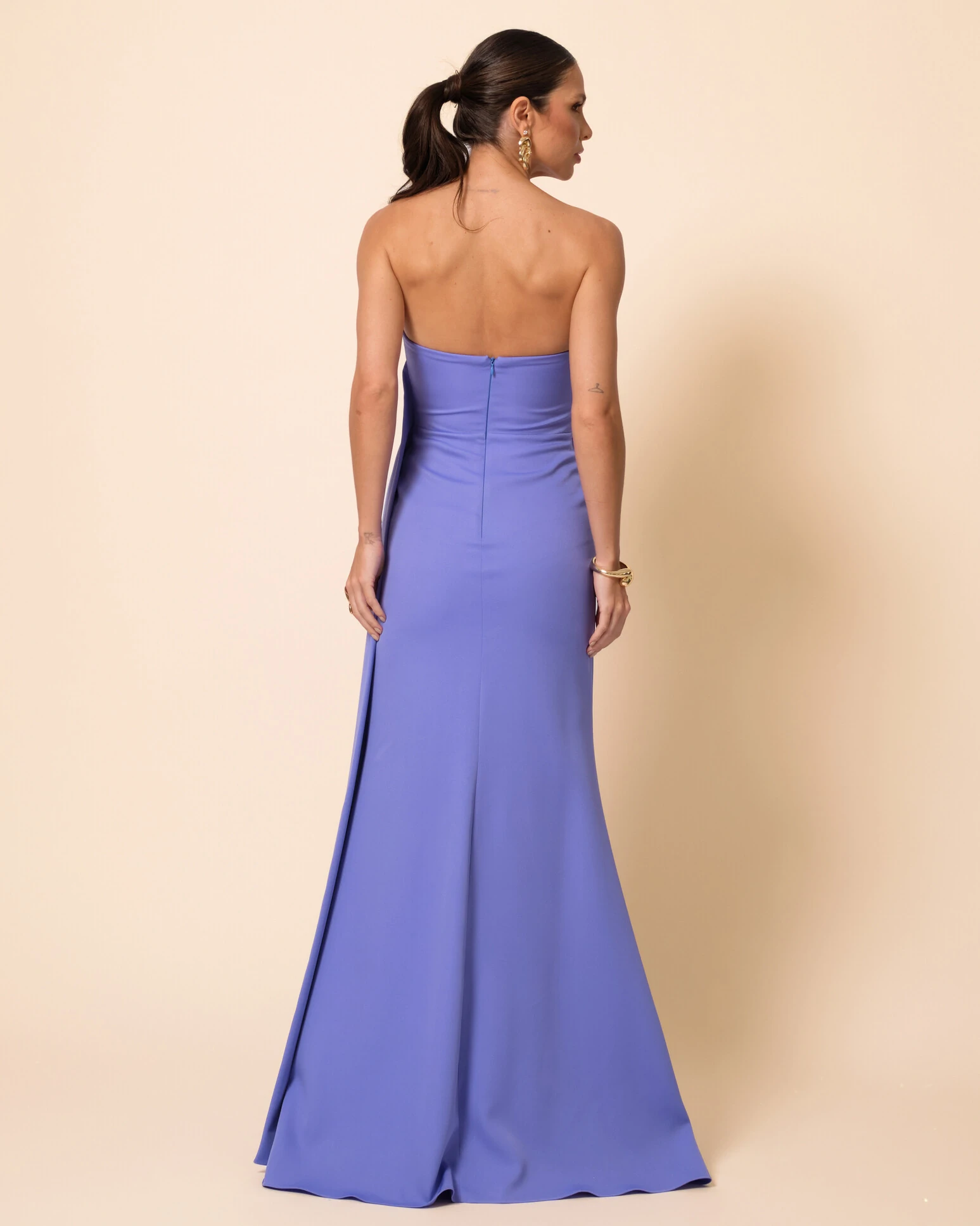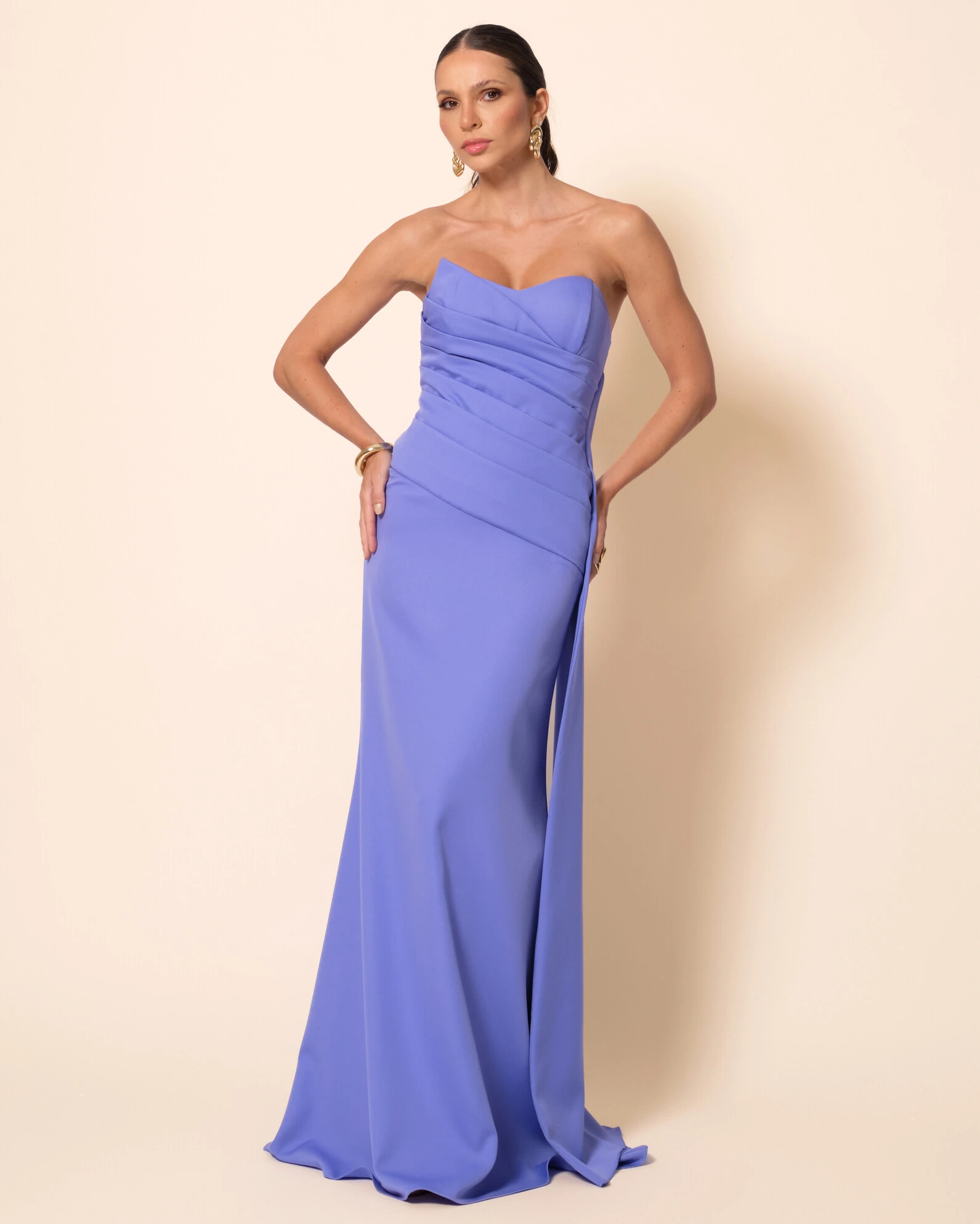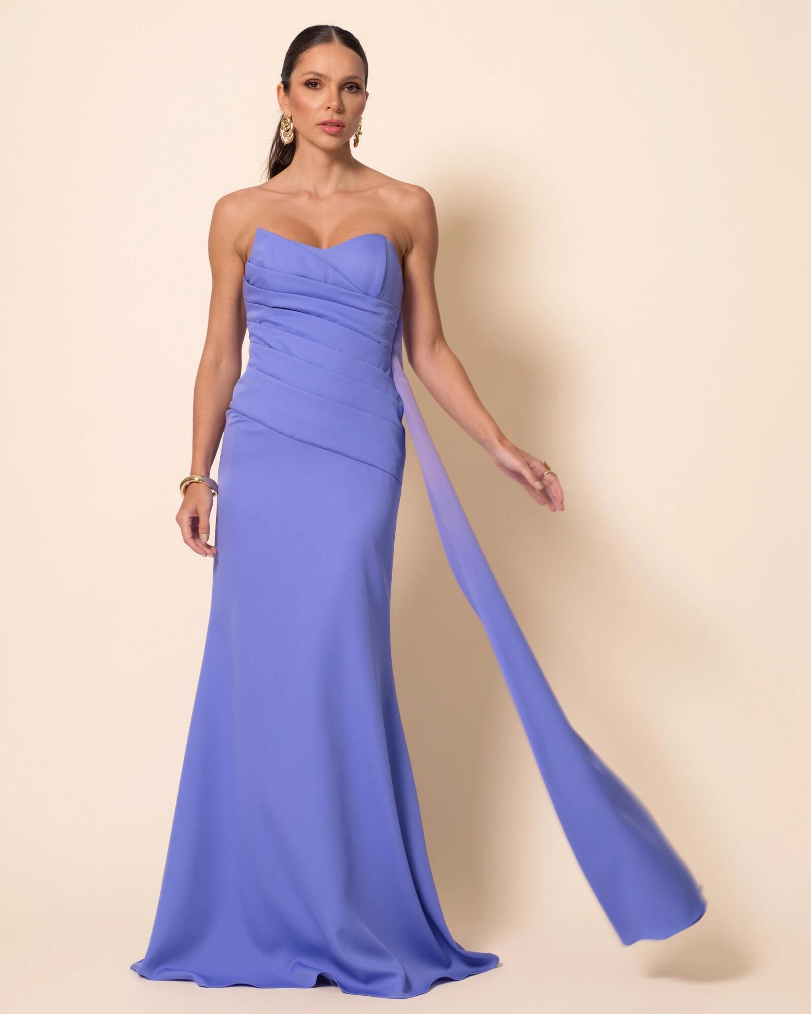 Confeccionado em alfaiataria, este vestido apresenta estrutura impecável que realça a silhueta, com busto tomara que caia modelado e drapeados estratégicos que adicionam elegância ao caimento; a peça conta ainda com um lenço integrado na cintura, que cria leve movimento e um detalhe moderno, enquanto a saia alongada mantém linhas limpas e sofisticadas típicas do acabamento alfaiatado.