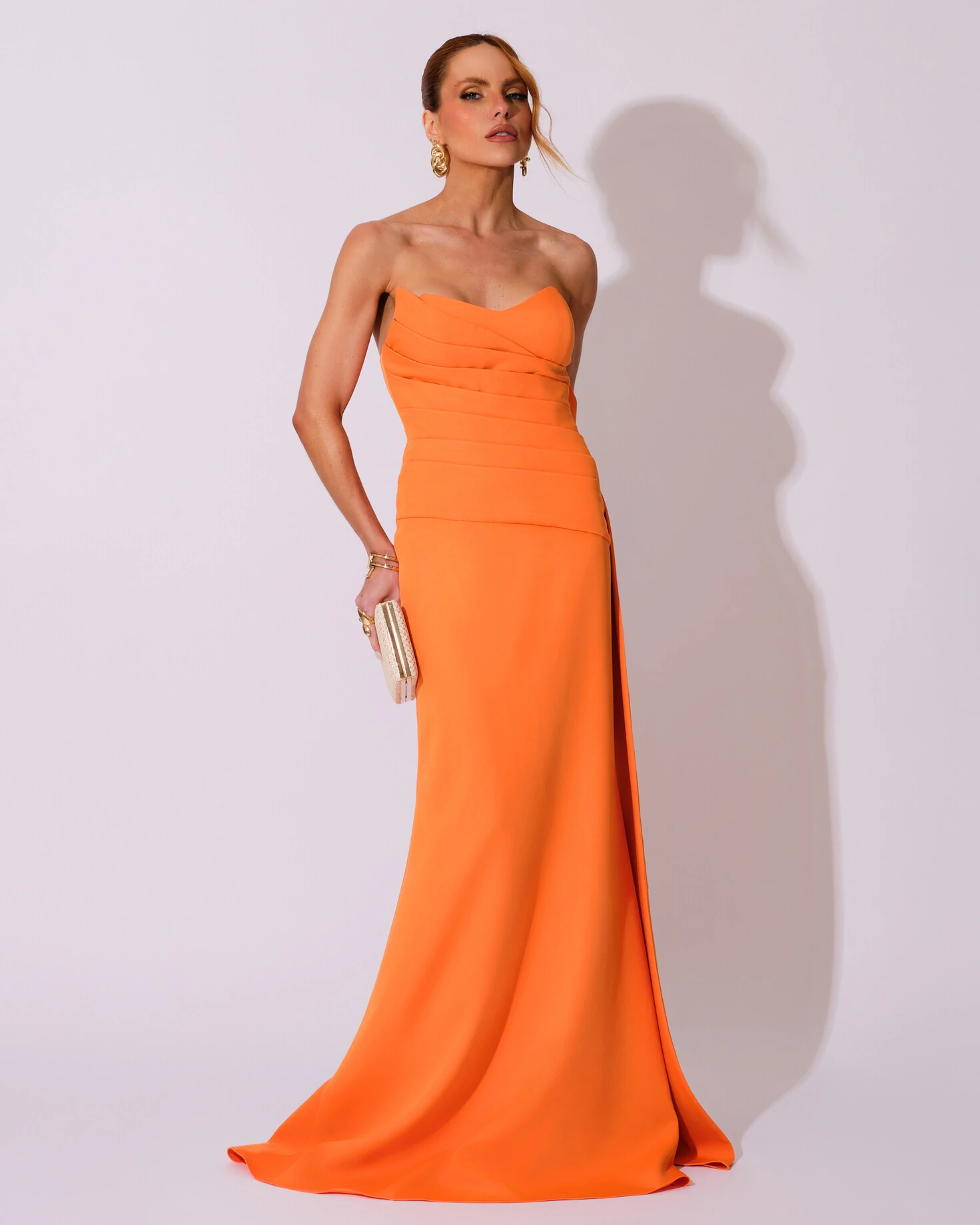 Vestido de Festa Longo Alfaiataria Tomara que Caia Drapeado Faixa Laranja