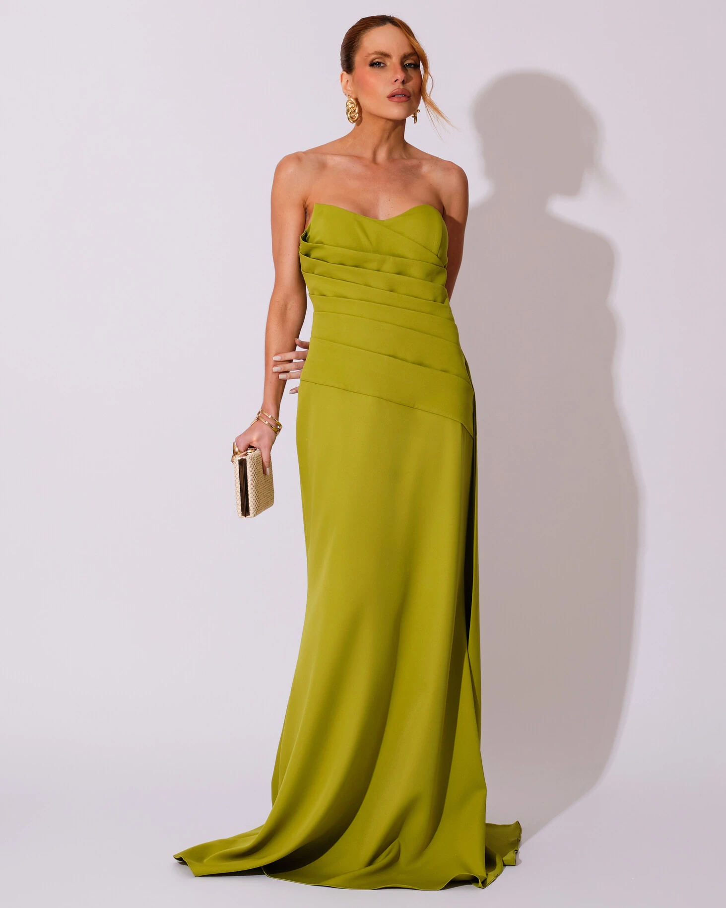 Vestido de Festa Longo Alfaiataria Tomara que Caia Drapeado Faixa Verde Pistache
