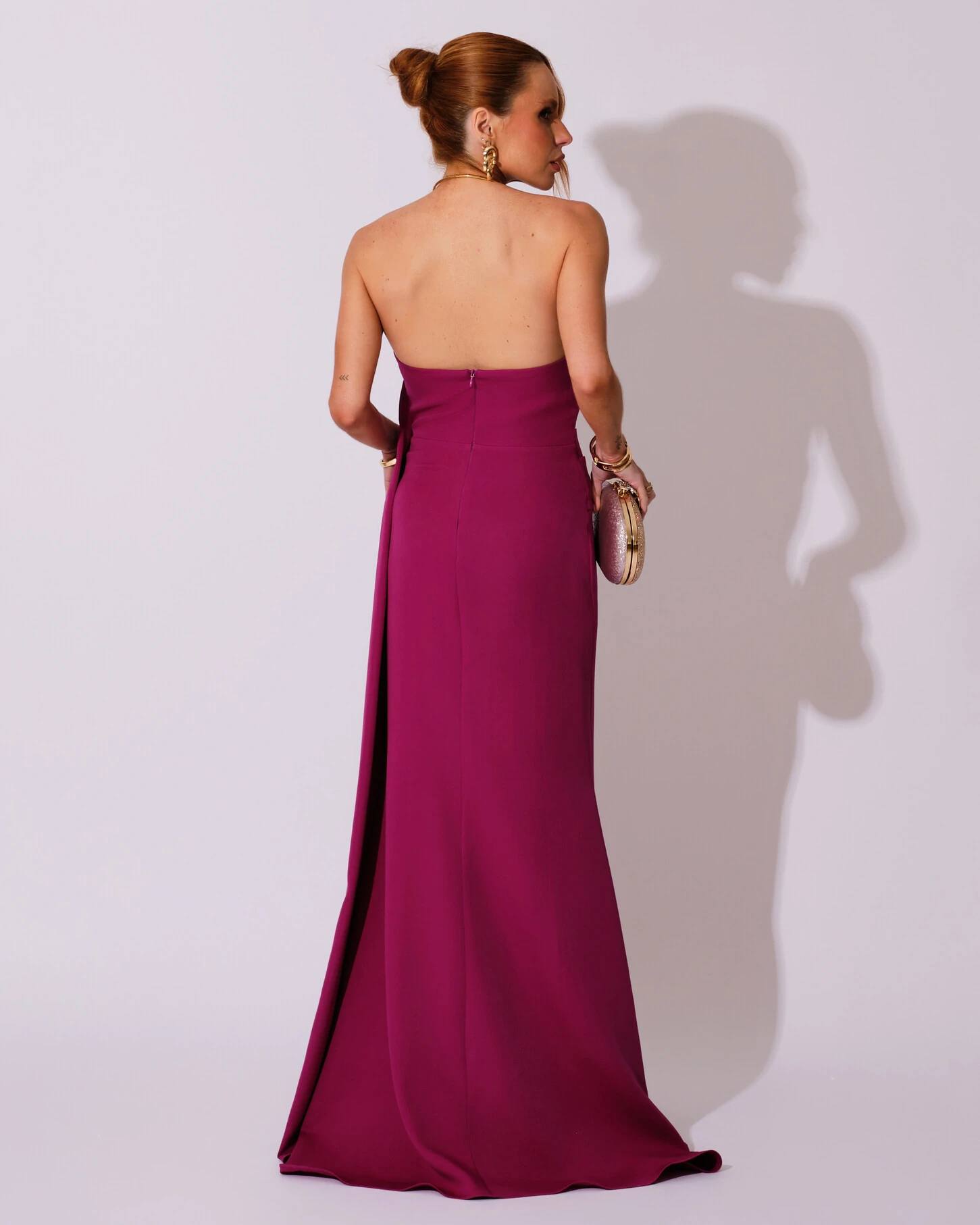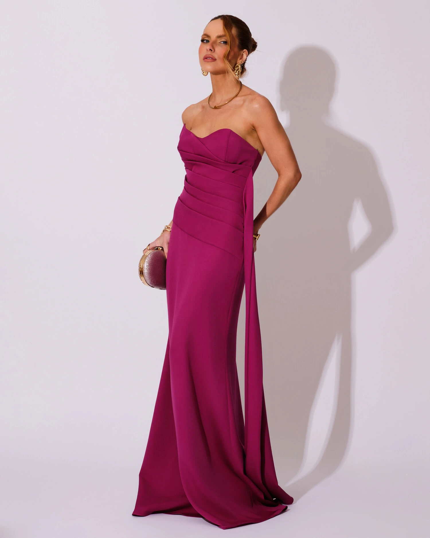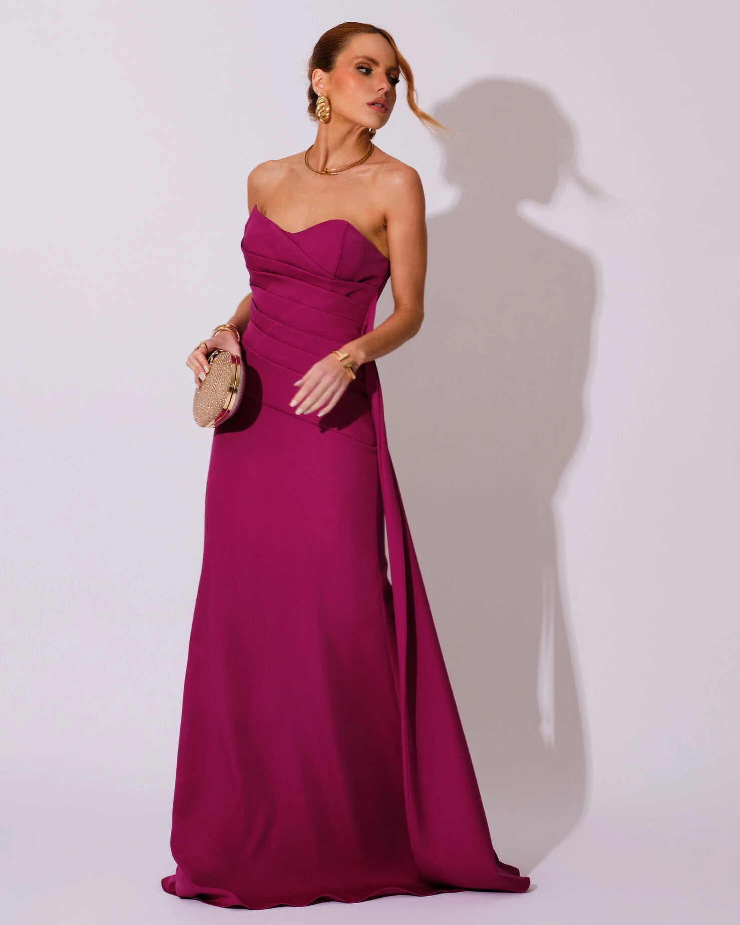 Confeccionado em alfaiataria, este vestido apresenta estrutura impecável que realça a silhueta, com busto tomara que caia modelado e drapeados estratégicos que adicionam elegância ao caimento; a peça conta ainda com um lenço integrado na cintura, que cria leve movimento e um detalhe moderno, enquanto a saia alongada mantém linhas limpas e sofisticadas típicas do acabamento alfaiatado.