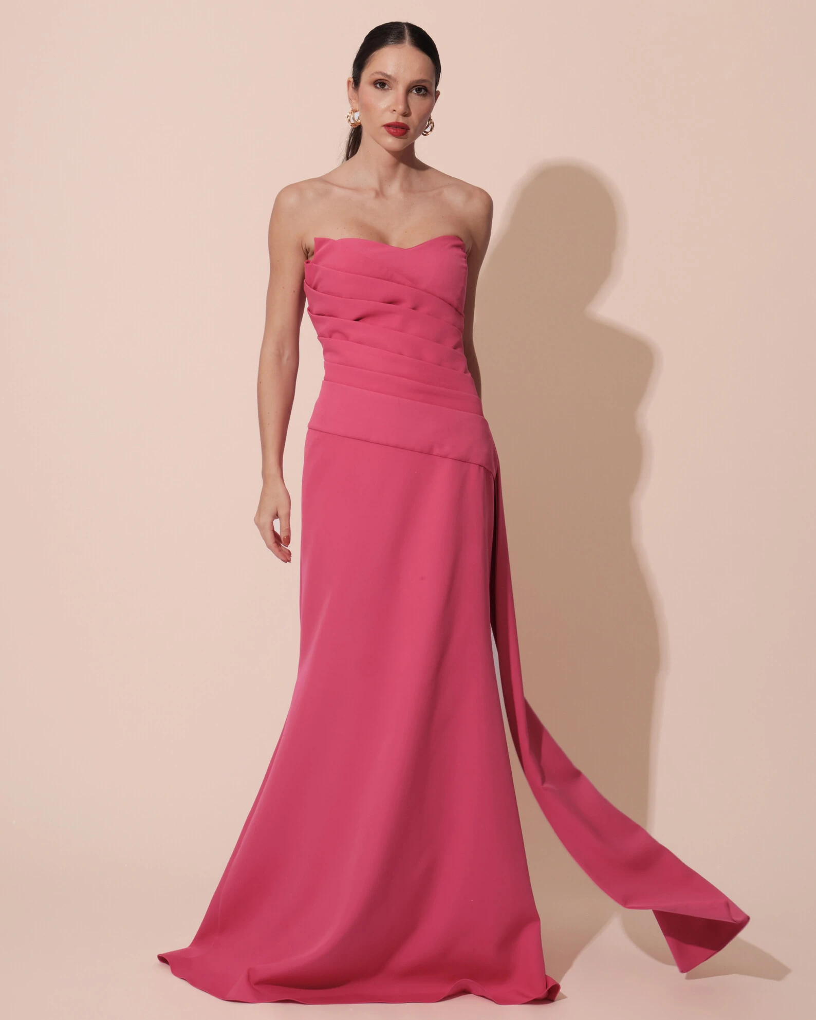 VESTIDO DE FESTA LONGO ALFAIATARIA TOMARA QUE CAIA DRAPEADO FAIXA - Este modelo longo traz um visual elegante e moderno, com busto estruturado tomara que caia, drapeados que valorizam a silhueta e um faixa integrado à cintura que adiciona movimento e charme ao look; ele combina perfeitamente com acessórios metalizados como brincos alongados, pulseiras delicadas ou uma clutch sofisticada, além de sandálias de salto fino para completar a produção. Ideal para casamentos, formaturas, eventos noturnos ou celebrações especiais que pedem um toque de glamour sem exageros.