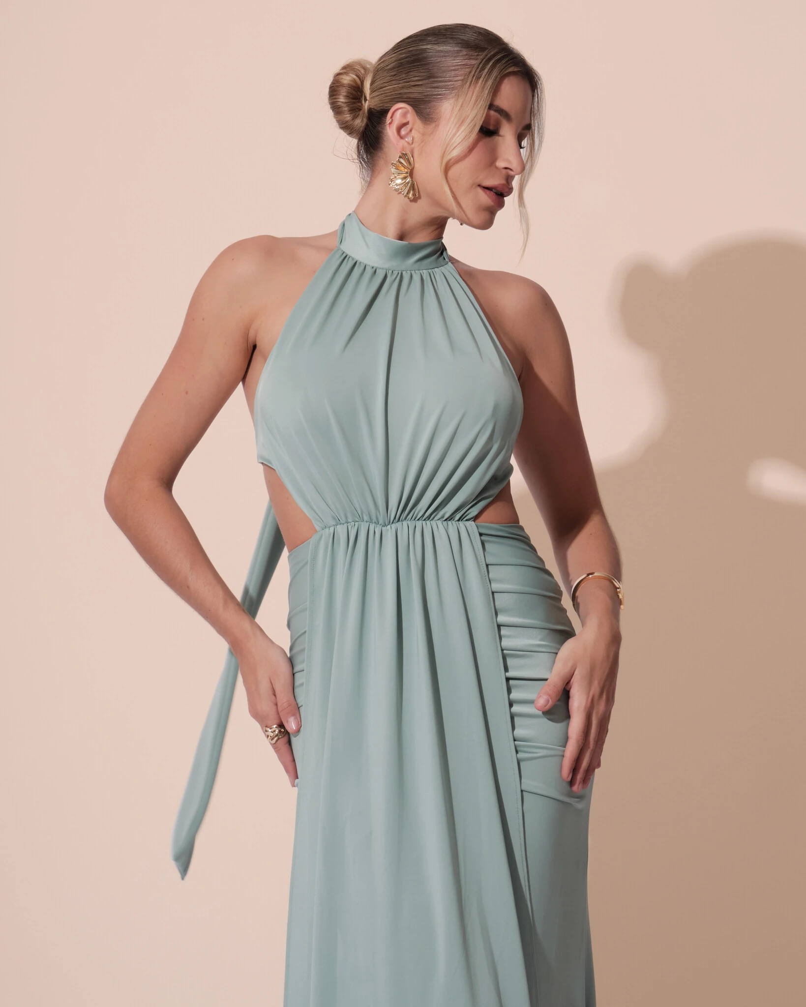 O vestido é confeccionado em malha jersey, um tecido de caimento leve e fluido que se ajusta suavemente ao corpo, proporcionando conforto e elegância. Possui modelagem longa com decote halter e gola alta, destacando os ombros e o pescoço de forma sofisticada. As laterais abertas adicionam um toque sensual e moderno, enquanto o drapeado sutil na região da cintura cria um efeito alongado e valorizador da silhueta. O caimento do tecido confere movimento e brilho discreto, ideal para ocasiões especiais.