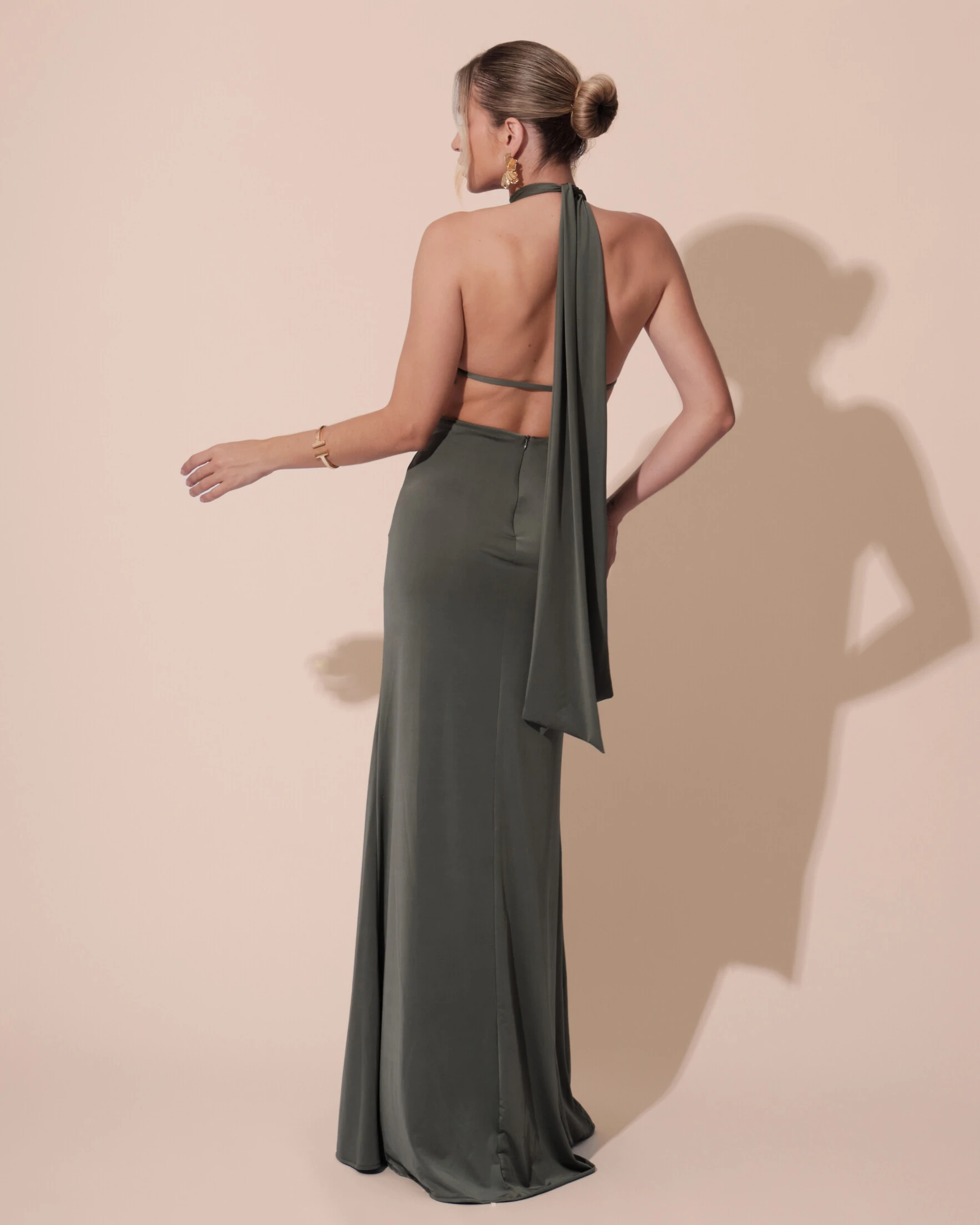 O vestido é confeccionado em malha jersey, um tecido de caimento leve e fluido que se ajusta suavemente ao corpo, proporcionando conforto e elegância. Possui modelagem longa com decote halter e gola alta, destacando os ombros e o pescoço de forma sofisticada. As laterais abertas adicionam um toque sensual e moderno, enquanto o drapeado sutil na região da cintura cria um efeito alongado e valorizador da silhueta. O caimento do tecido confere movimento e brilho discreto, ideal para ocasiões especiais.