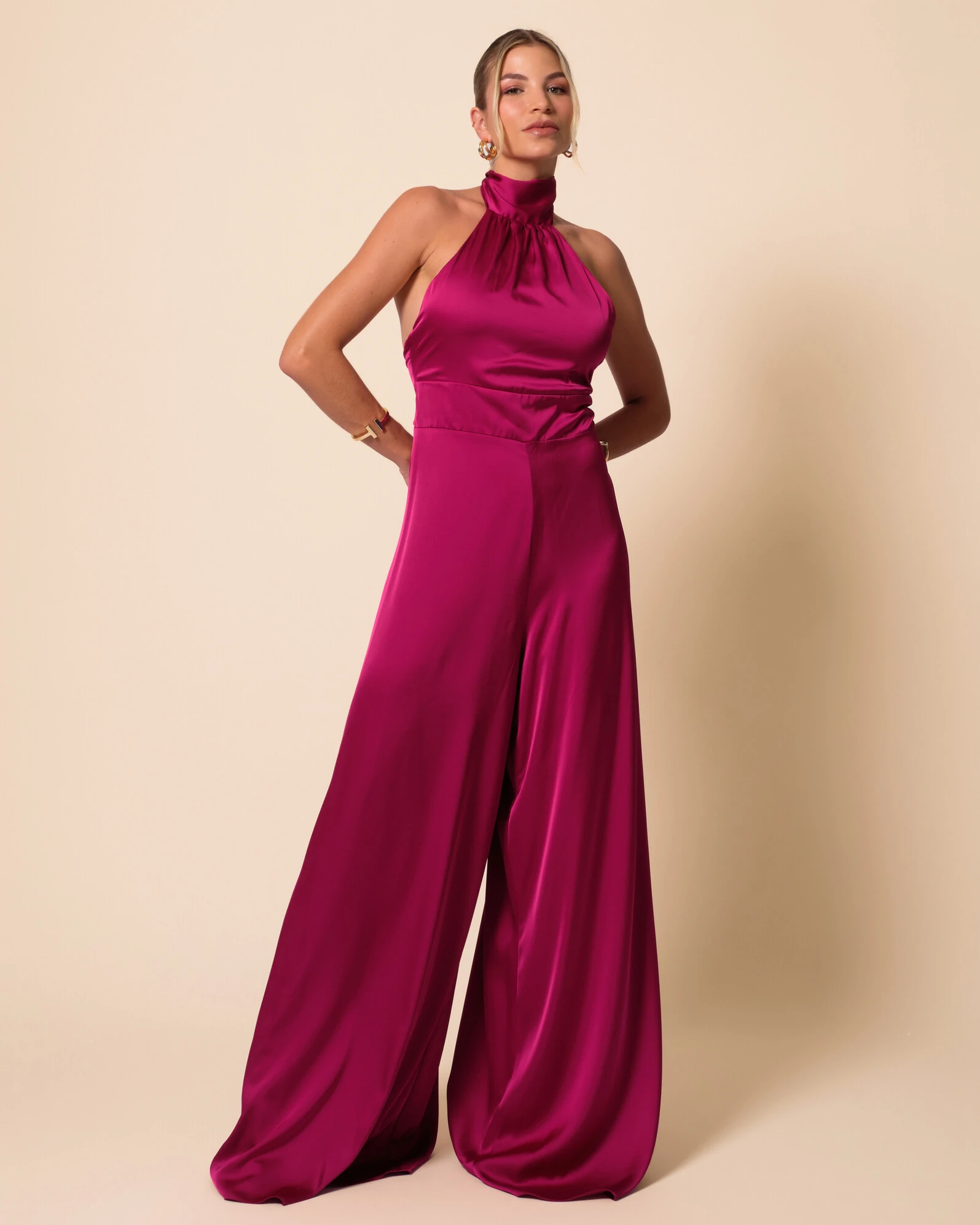 Macacão longo confeccionado em cetim, com brilho suave e toque acetinado, apresentando gola alta com leve franzido que valoriza o busto, recorte ajustado que define a cintura e caimento fluido ao longo das pernas, garantindo elegância e movimento. O grande destaque fica para as costas abertas, que adicionam sensualidade na medida certa e equilibram a sofisticação da frente com um acabamento moderno e refinado.