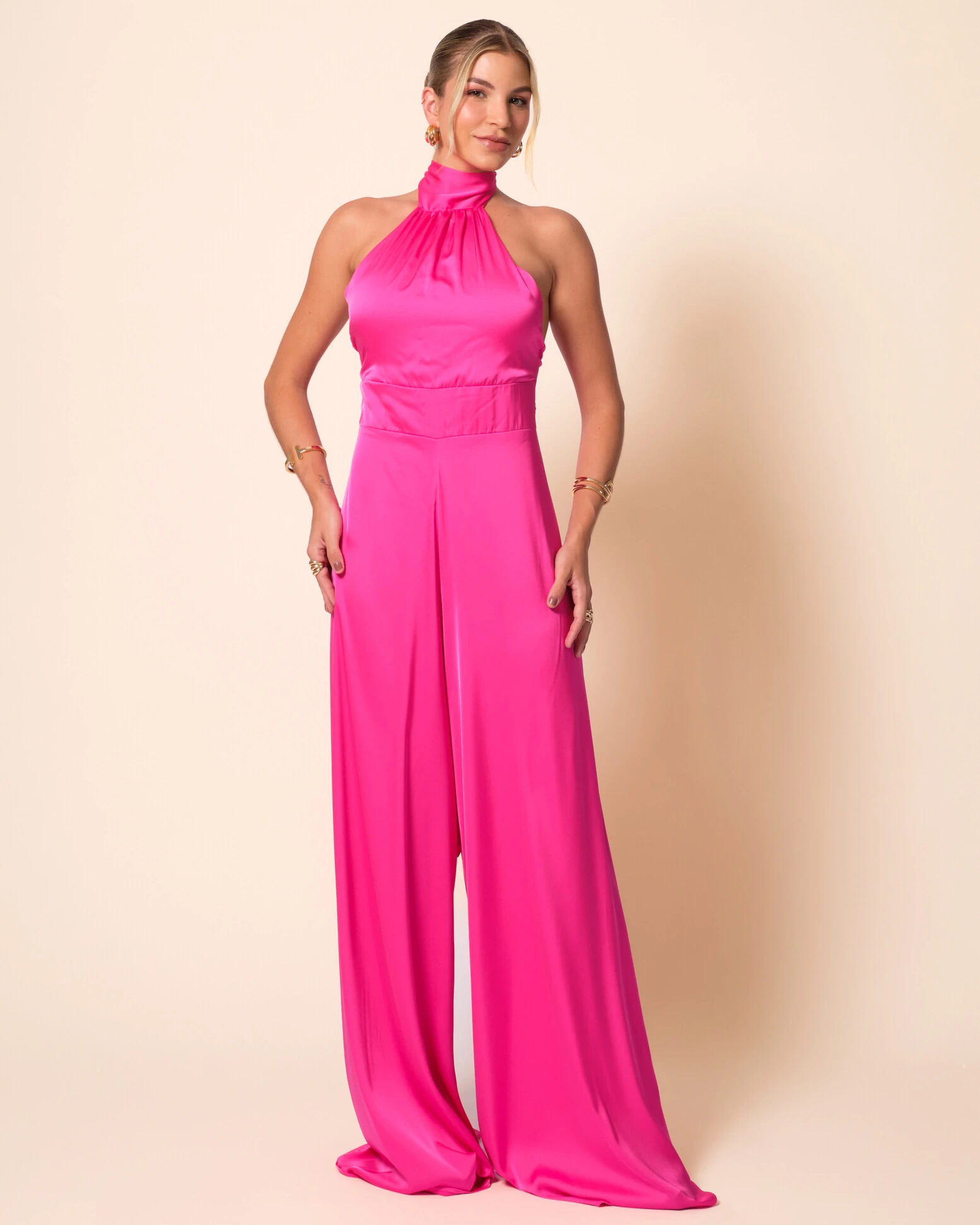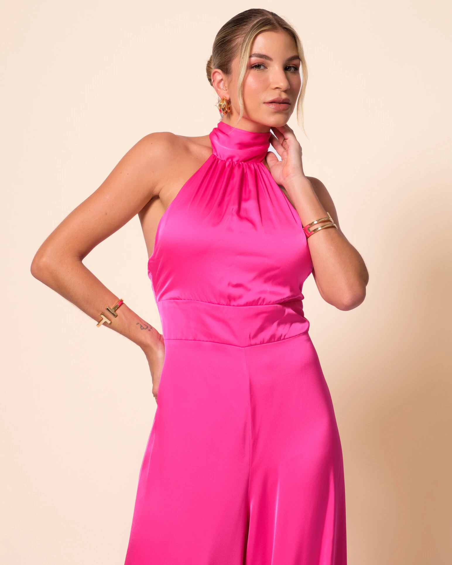 Macacão longo confeccionado em cetim, com brilho suave e toque acetinado, apresentando gola alta com leve franzido que valoriza o busto, recorte ajustado que define a cintura e caimento fluido ao longo das pernas, garantindo elegância e movimento. O grande destaque fica para as costas abertas, que adicionam sensualidade na medida certa e equilibram a sofisticação da frente com um acabamento moderno e refinado.