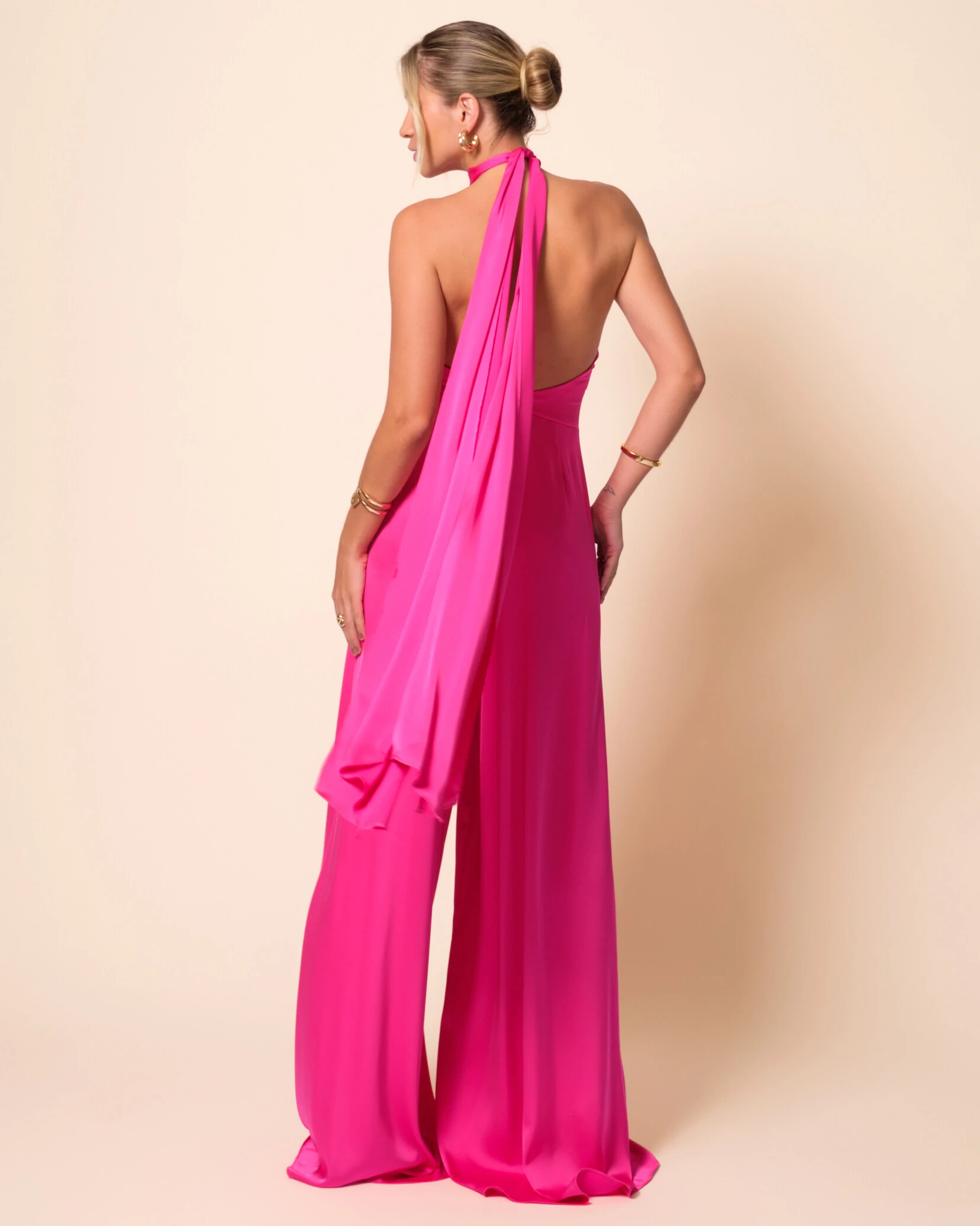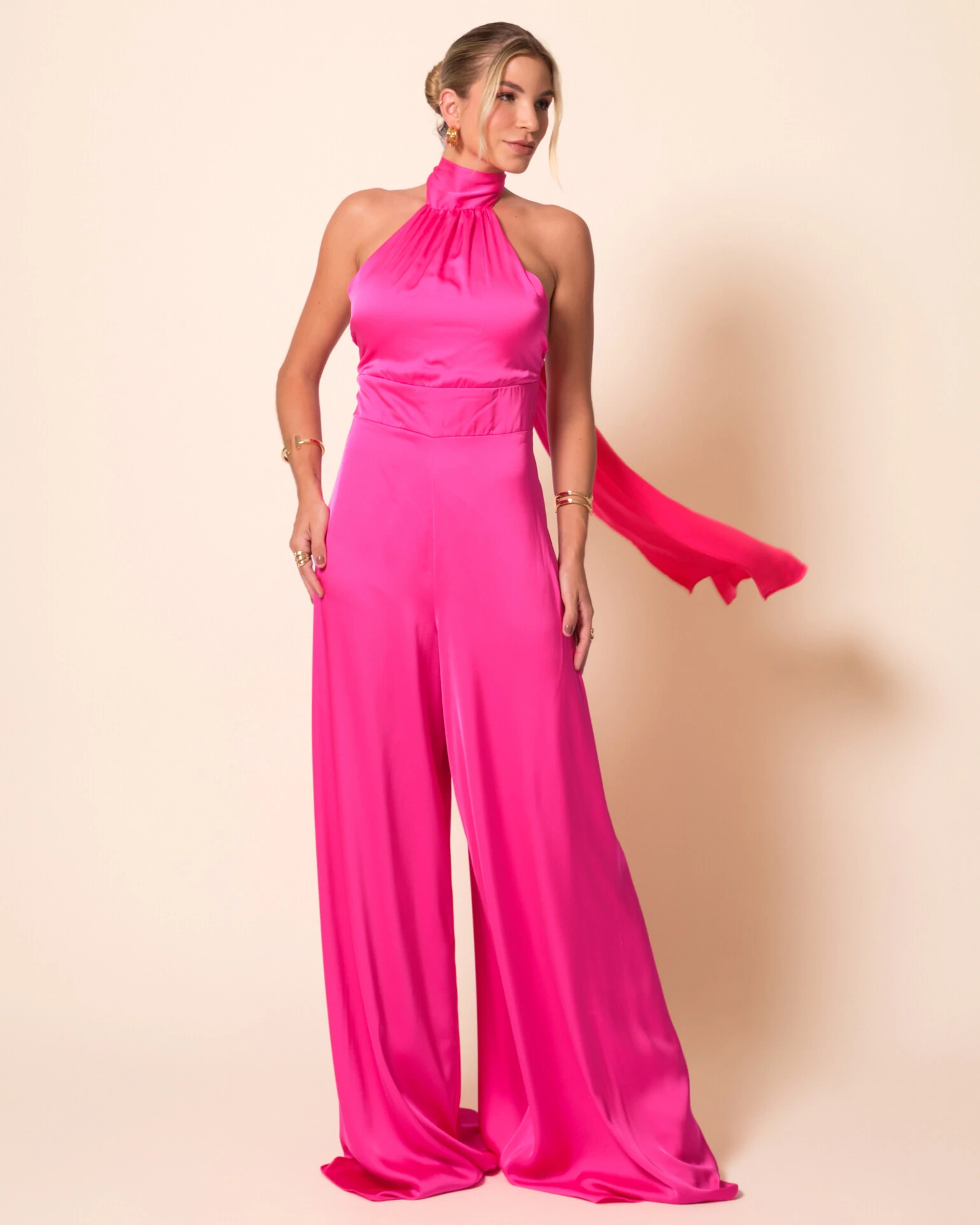 MACACÃO DE FESTA LONGO EM CETIM FLUIDO GOLA ALTA E LENÇO - Macacão longo com modelagem elegante e alongada, trazendo gola alta que valoriza o colo e cria um visual sofisticado e cintura marcada que define a silhueta, enquanto a parte inferior cai de forma fluida e reta, garantindo movimento e elegância. Ideal para ocasiões como casamentos, formaturas, festas noturnas, jantares especiais ou eventos sociais mais refinados, ele transita perfeitamente entre ambientes fechados e espaços ao ar livre à noite. Combine com sandálias de salto fino ou plataformas elegantes, clutch estruturada e acessórios delicados como brincos alongados ou ponto de luz; para um toque mais fashionista, aposte em pulseiras minimalistas ou um mix de anéis e finalize com penteado preso ou semi-preso para destacar a gola.