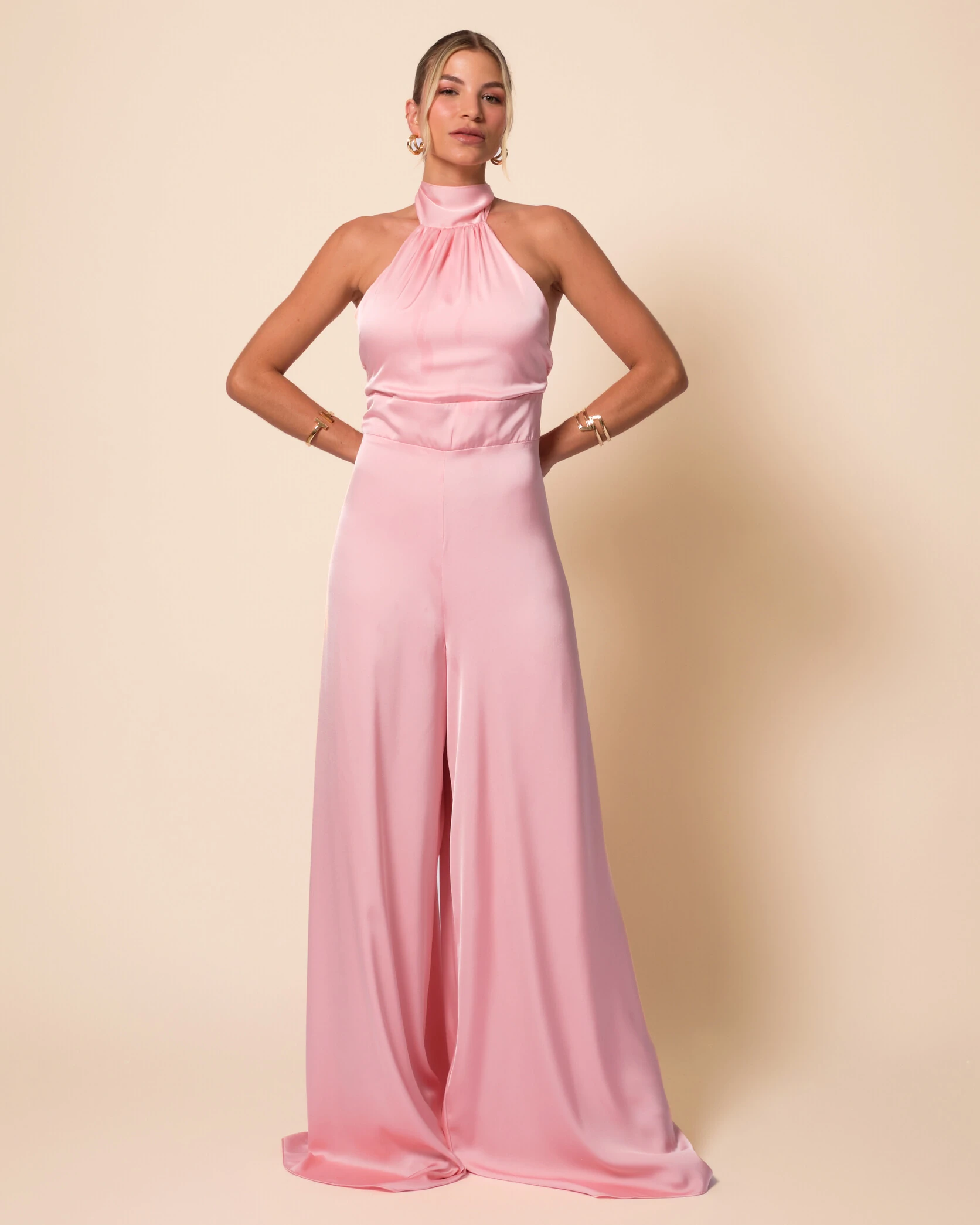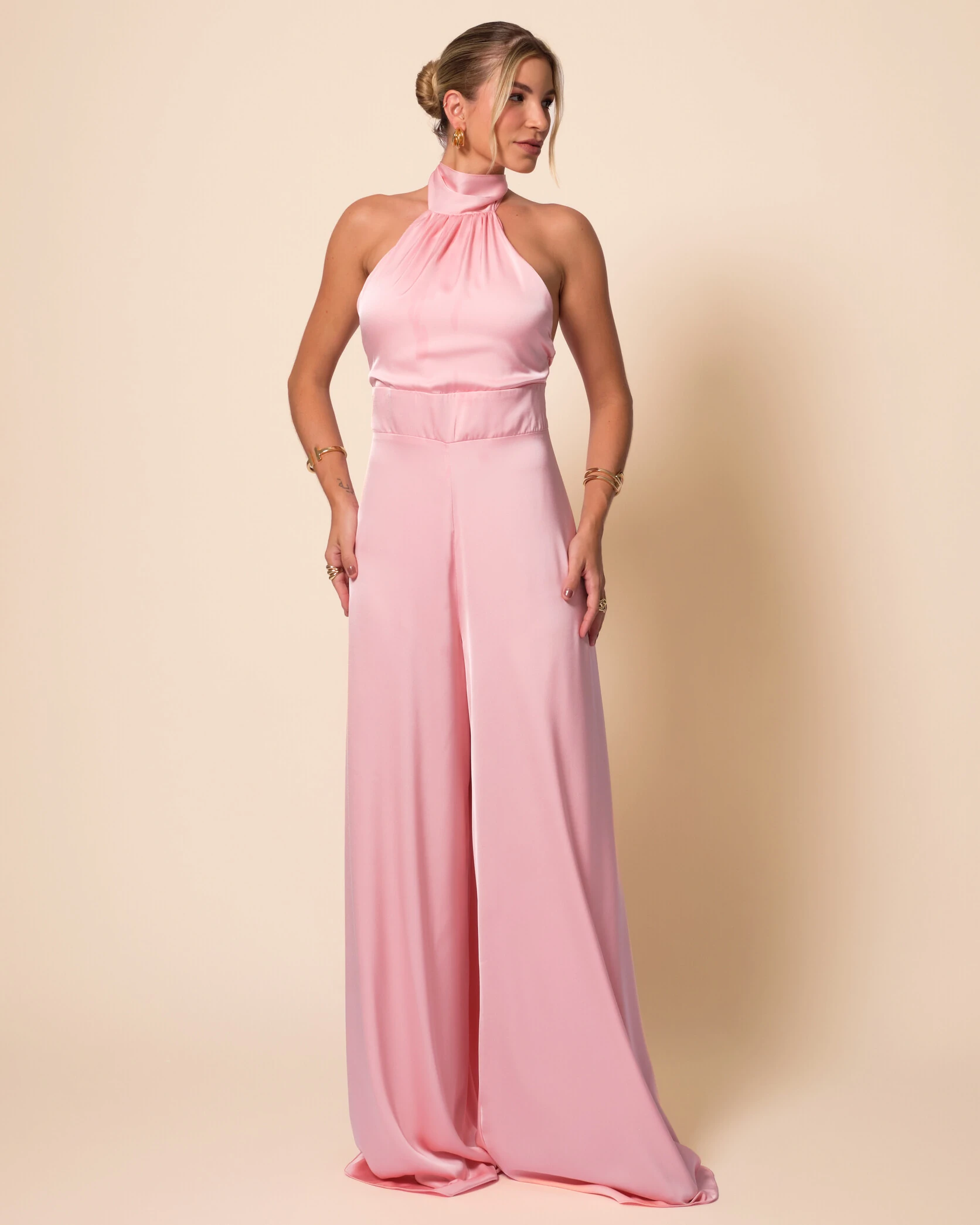 Macacão de Festa Longo em Cetim Fluido com Gola Alta e Lenço Rose Gold