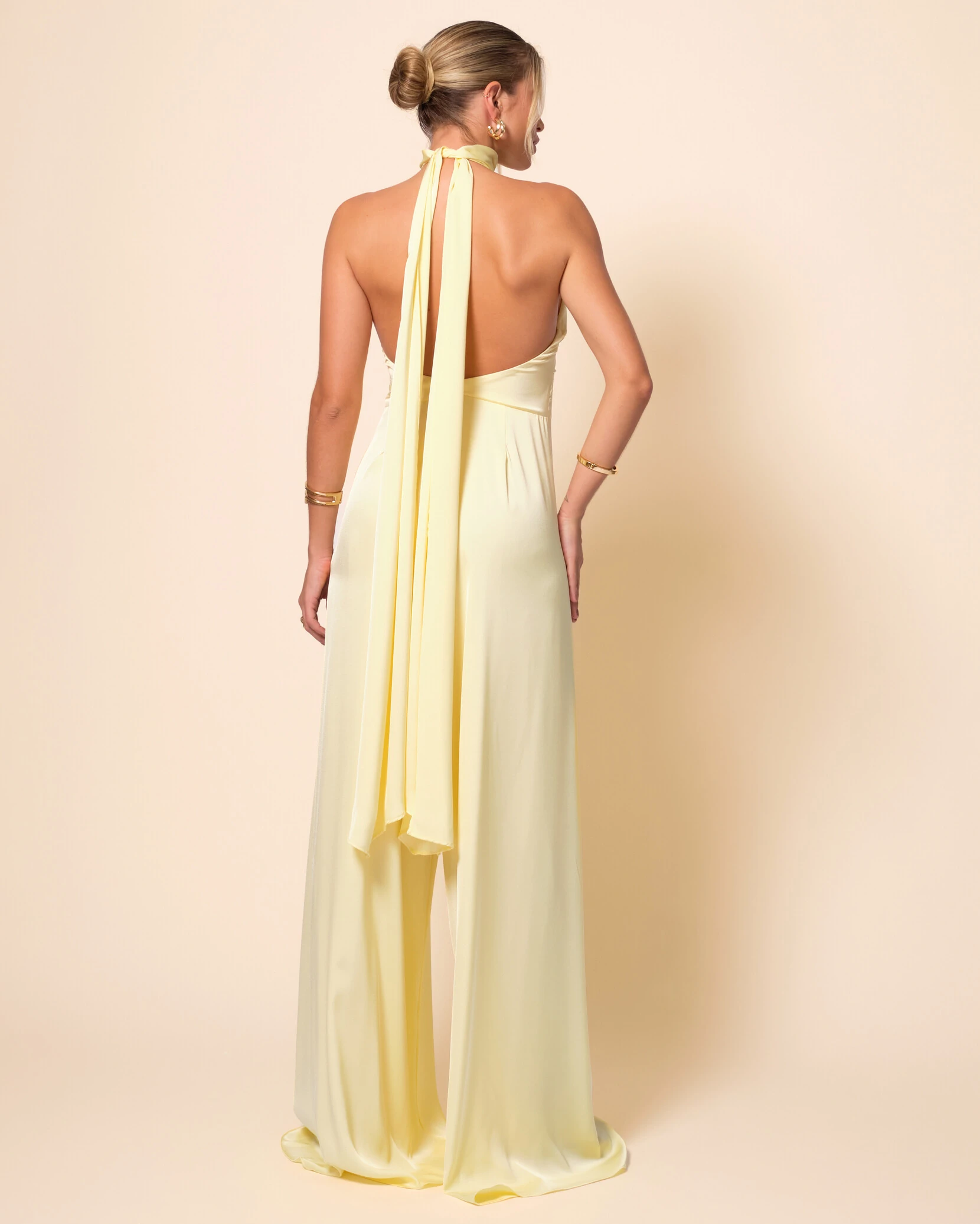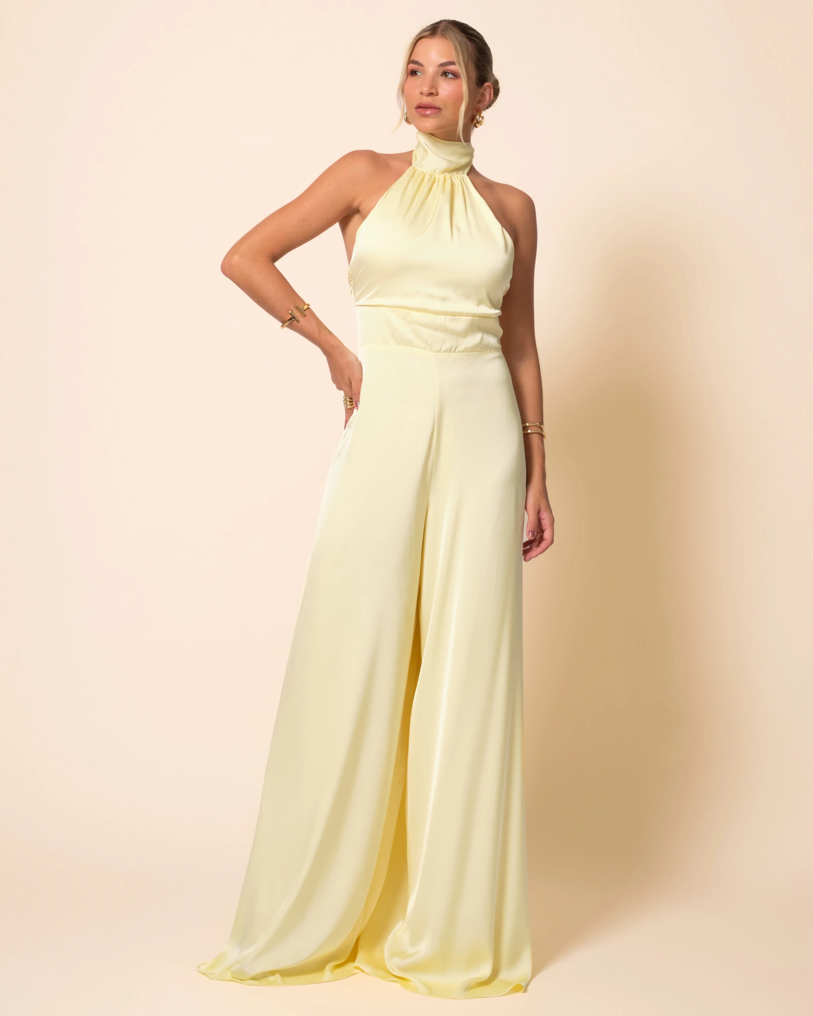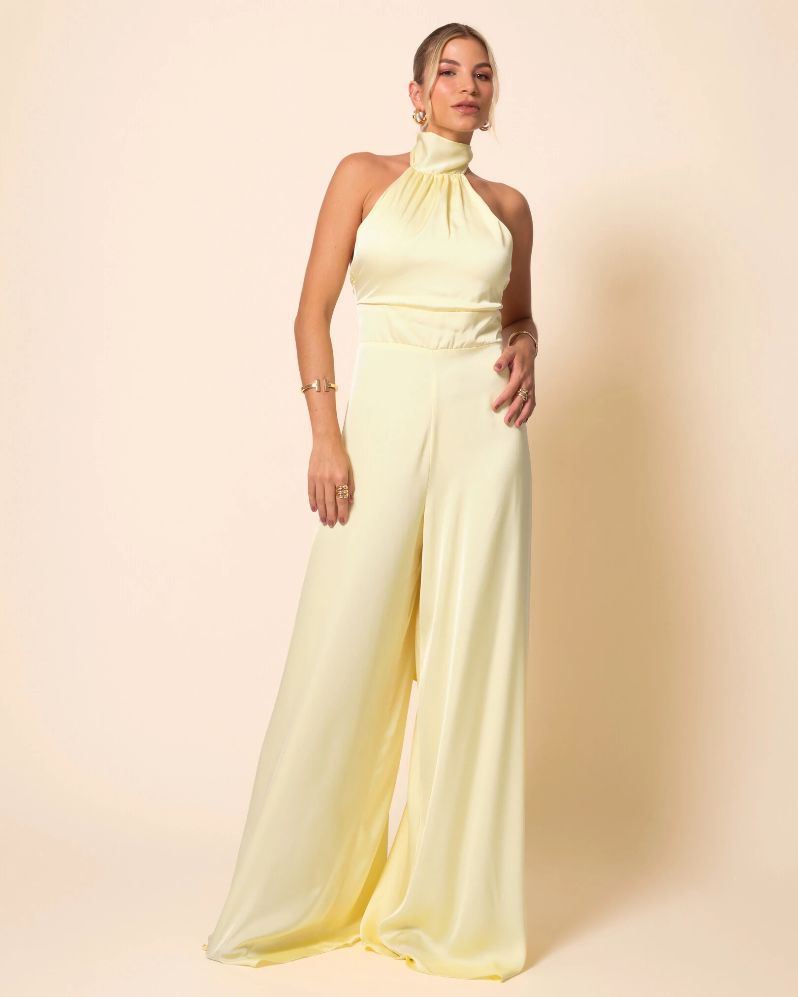 Macacão longo confeccionado em cetim, com brilho suave e toque acetinado, apresentando gola alta com leve franzido que valoriza o busto, recorte ajustado que define a cintura e caimento fluido ao longo das pernas, garantindo elegância e movimento. O grande destaque fica para as costas abertas, que adicionam sensualidade na medida certa e equilibram a sofisticação da frente com um acabamento moderno e refinado.
