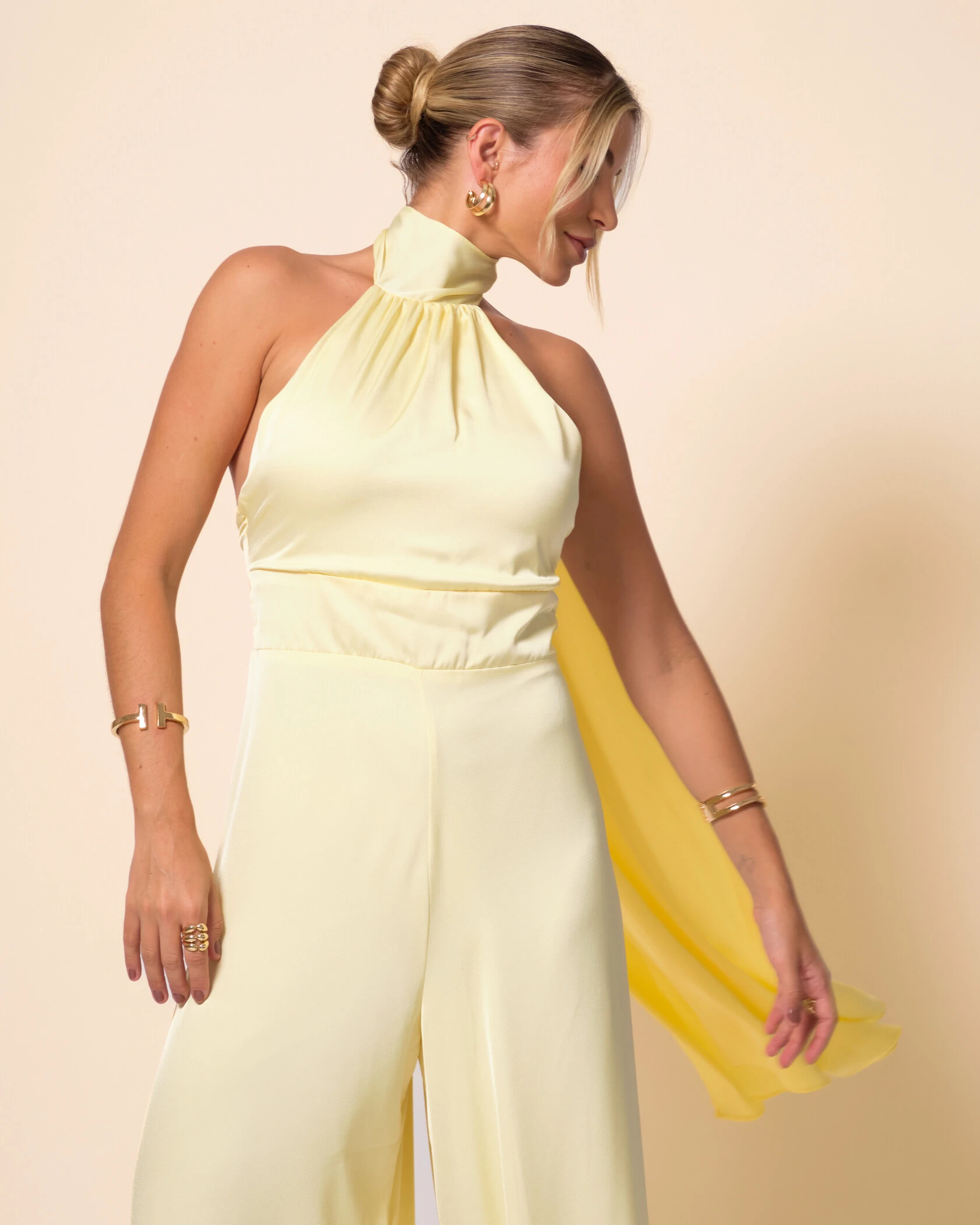 MACACÃO DE FESTA LONGO EM CETIM FLUIDO GOLA ALTA E LENÇO - Macacão longo com modelagem elegante e alongada, trazendo gola alta que valoriza o colo e cria um visual sofisticado e cintura marcada que define a silhueta, enquanto a parte inferior cai de forma fluida e reta, garantindo movimento e elegância. Ideal para ocasiões como casamentos, formaturas, festas noturnas, jantares especiais ou eventos sociais mais refinados, ele transita perfeitamente entre ambientes fechados e espaços ao ar livre à noite. Combine com sandálias de salto fino ou plataformas elegantes, clutch estruturada e acessórios delicados como brincos alongados ou ponto de luz; para um toque mais fashionista, aposte em pulseiras minimalistas ou um mix de anéis e finalize com penteado preso ou semi-preso para destacar a gola.